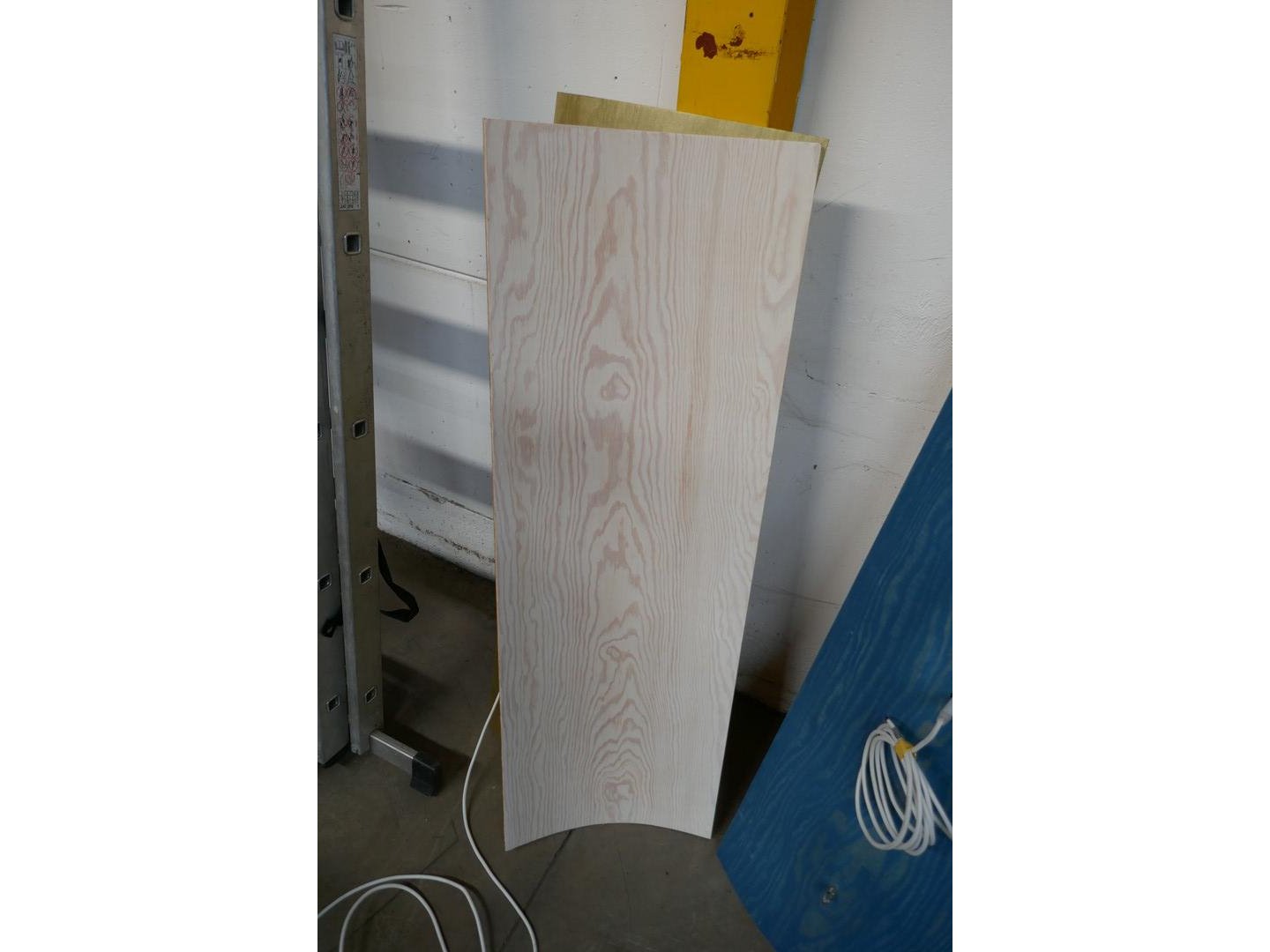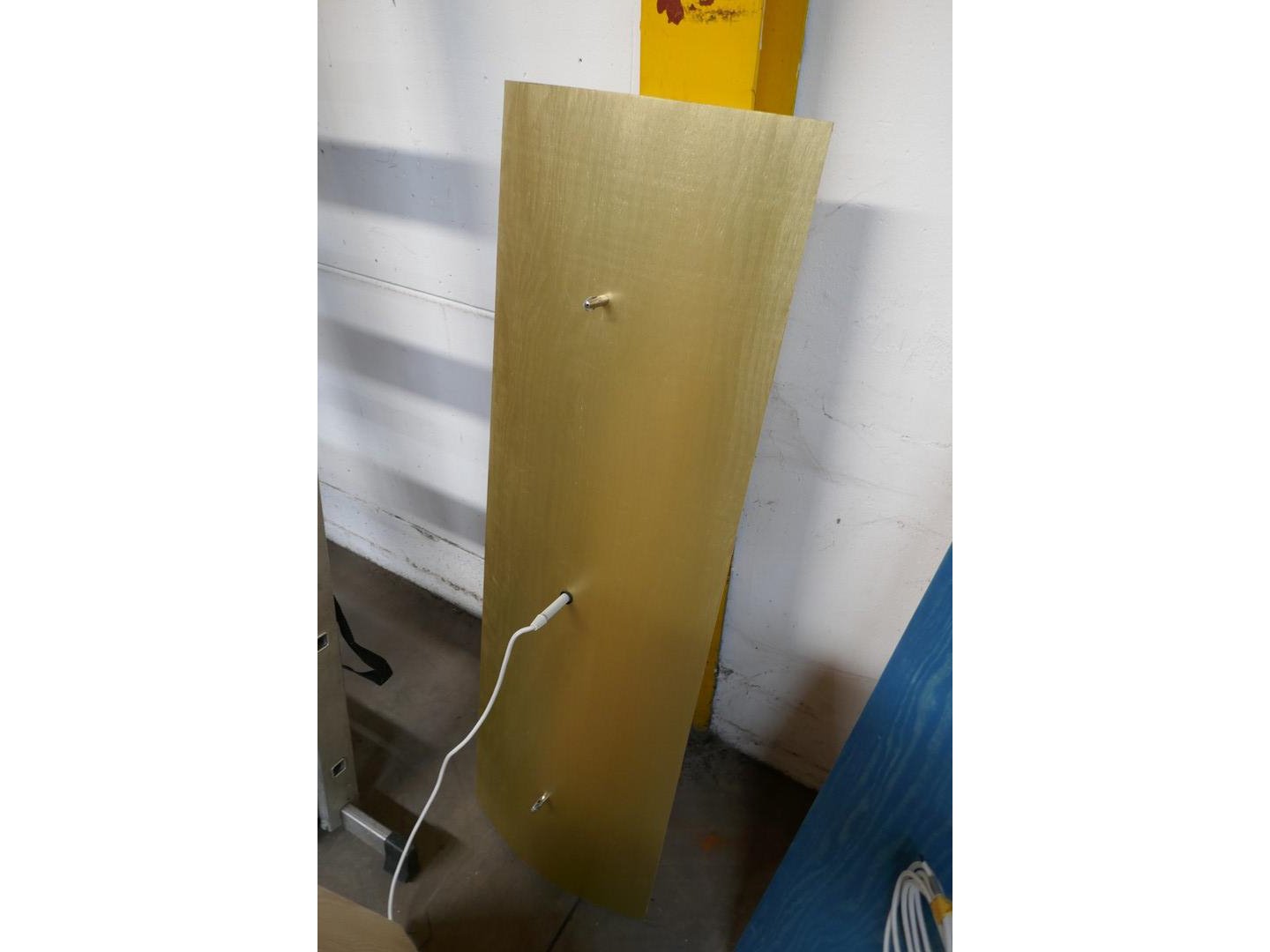 2 houten hanglampen gebogen borden goudkleurig <br /> *merk : DASSEIN <br /> OPGELET!!! 1 gebogen bord zonder verlichting
