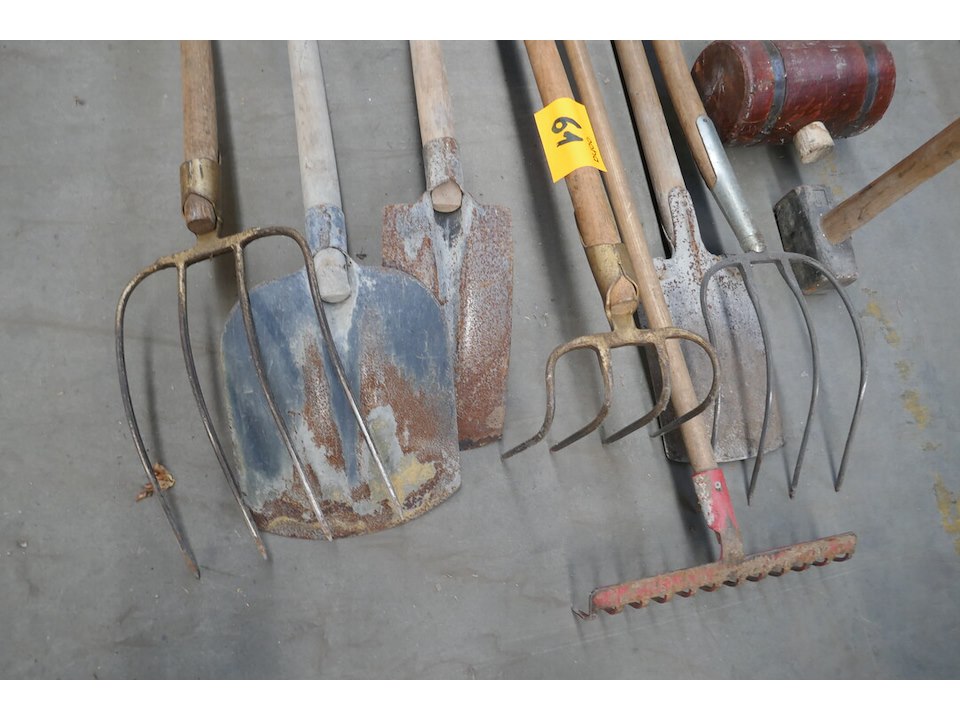 Landbouwgereedschap : hooivorken - spitvork - hooihark - houten hamer - schoppen - enz..