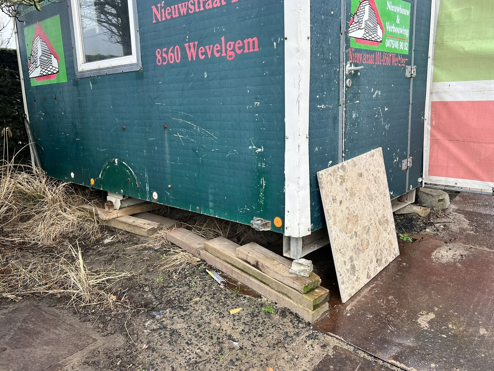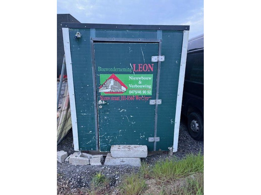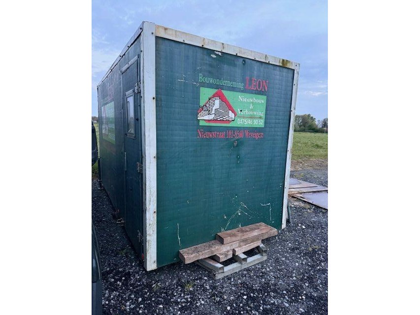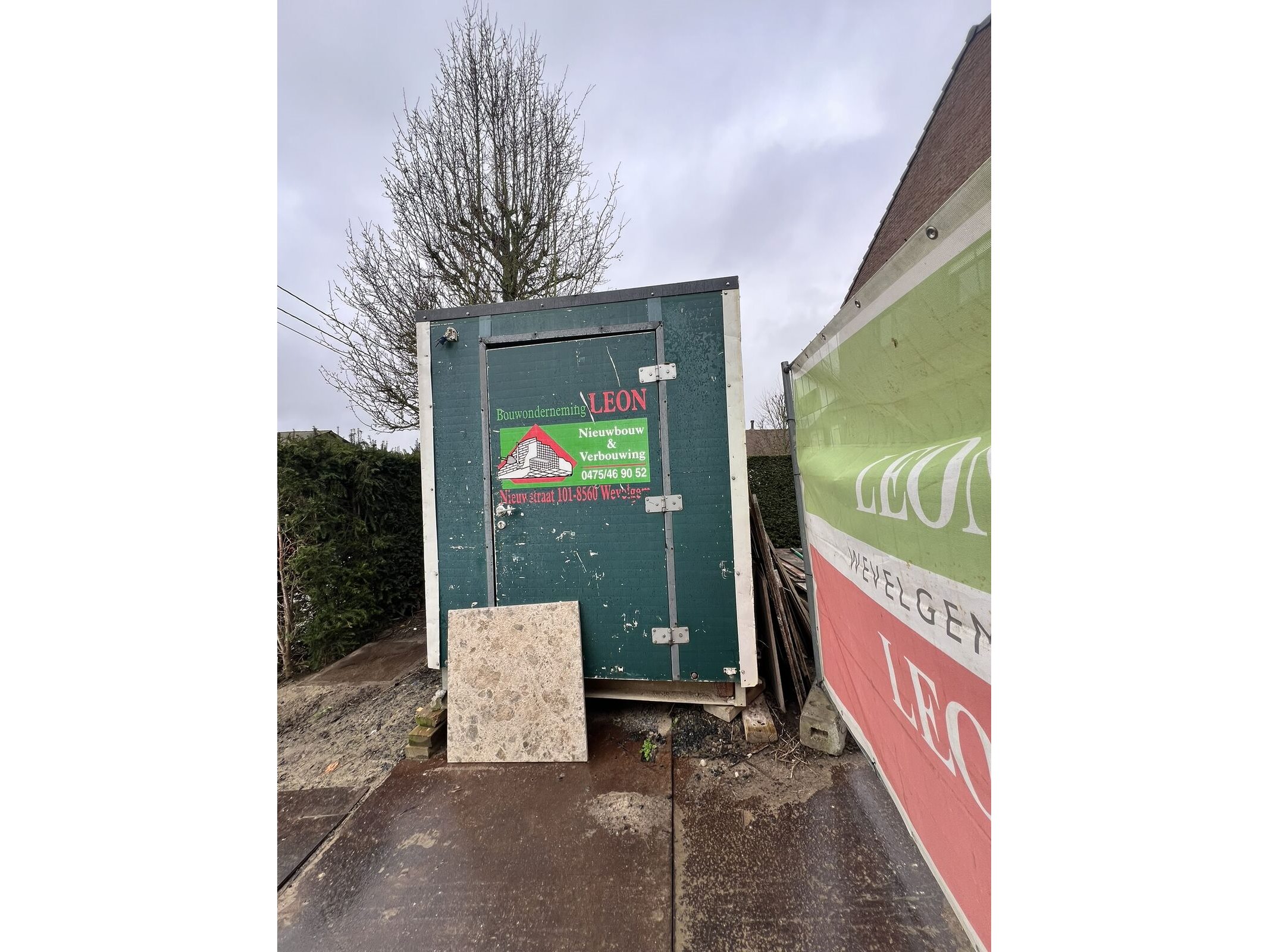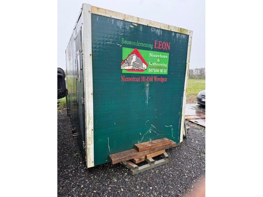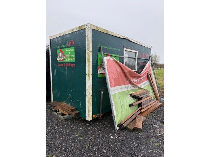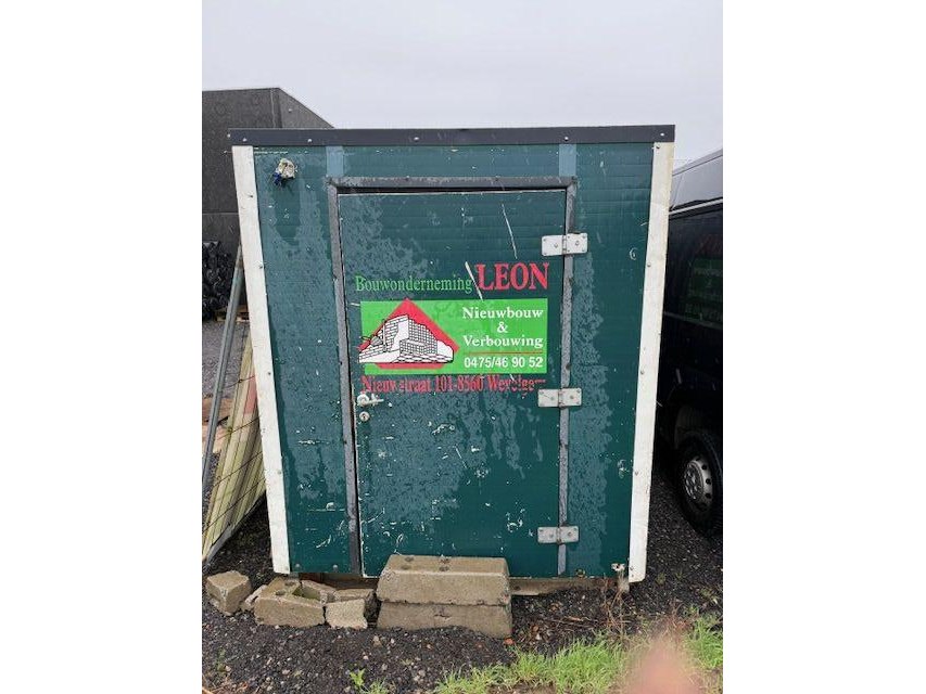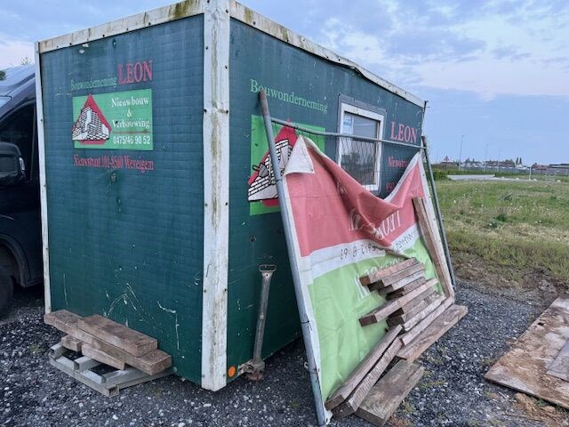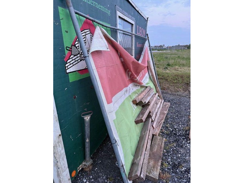 1 draaideur, ingericht met uitgietbakje en el. radiator<br /> mét inhoud (vestiairekast, tafel, stoelen<br /> afmetingen +/- 1,90 x 3,85 x 2,20 cmh<br /> + werfhekken <br /> + enkele houten balken<br /> Locatie: Ooigem