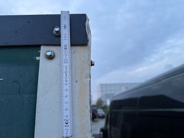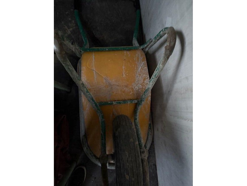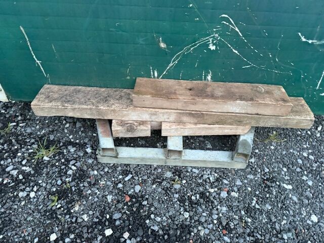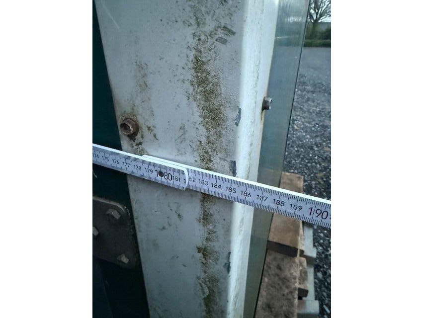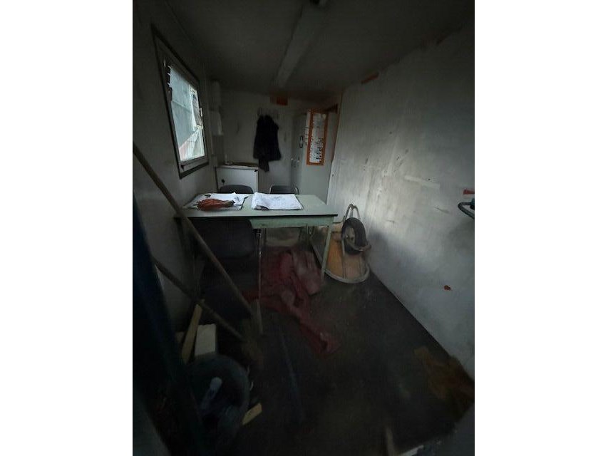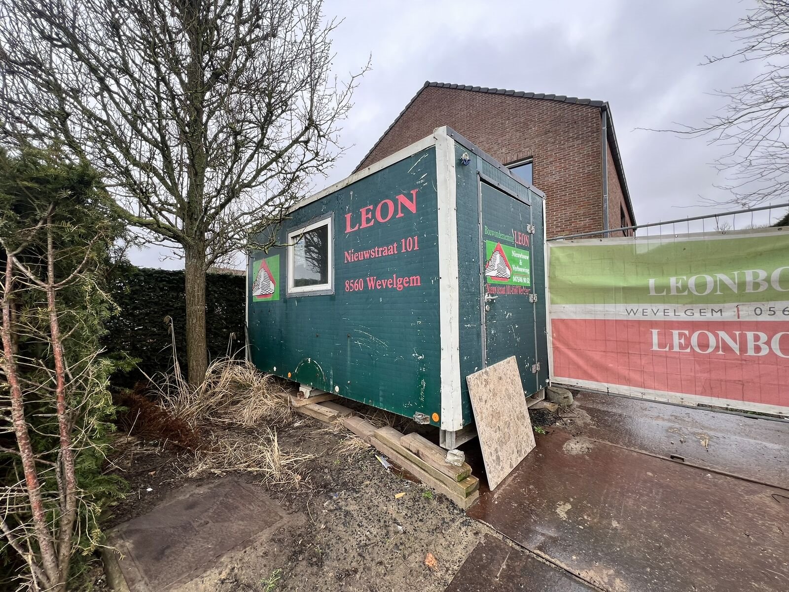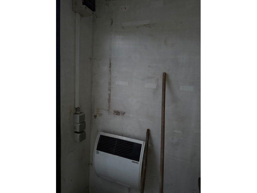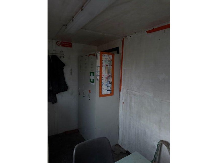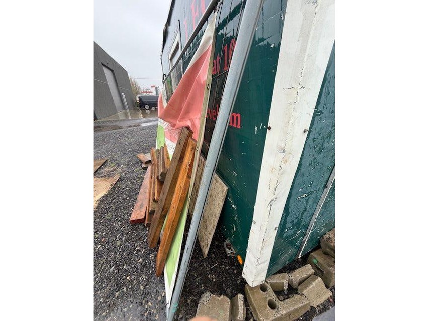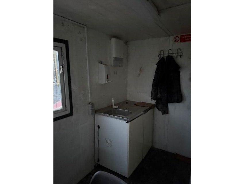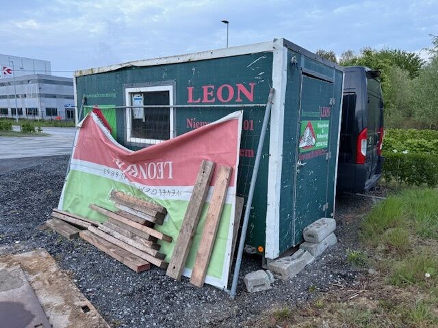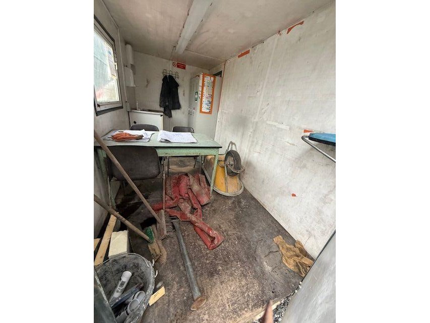 1 draaideur, ingericht met uitgietbakje en el. radiator<br /> mét inhoud (vestiairekast, tafel, stoelen<br /> afmetingen +/- 1,90 x 3,85 x 2,20 cmh<br /> + werfhekken <br /> + enkele houten balken<br /> Locatie: Ooigem