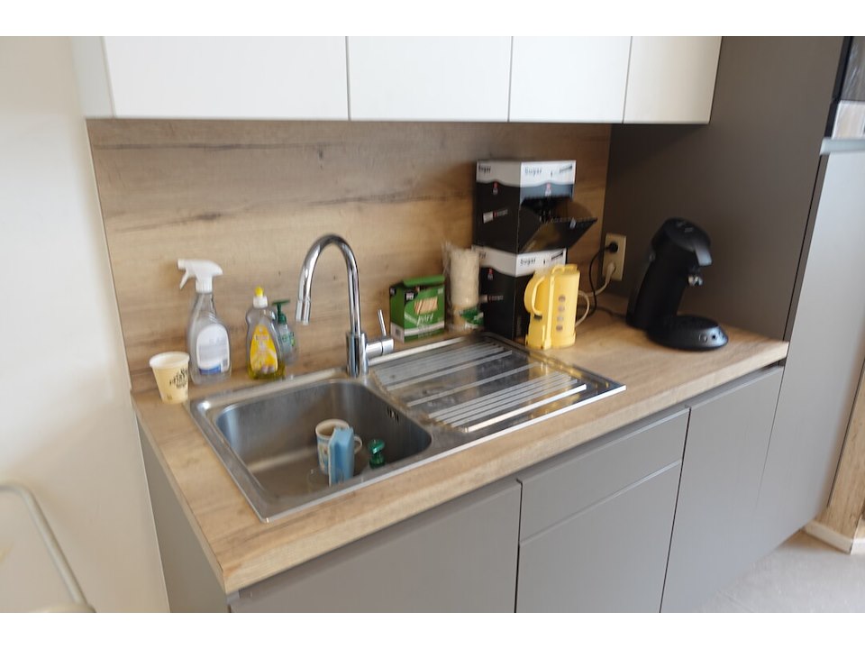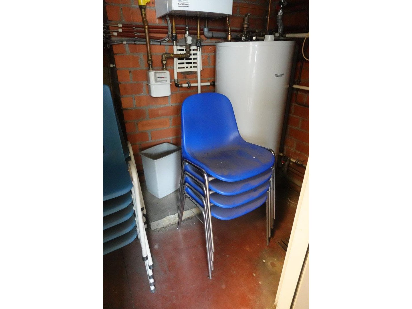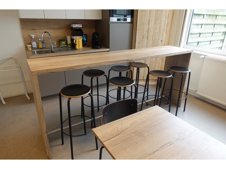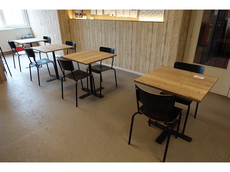 5x Tafel, 10x Stoel, 2x Hoge tafel, 7 x kruk, rek, Inhoud keuken <br /> locatie: Refter