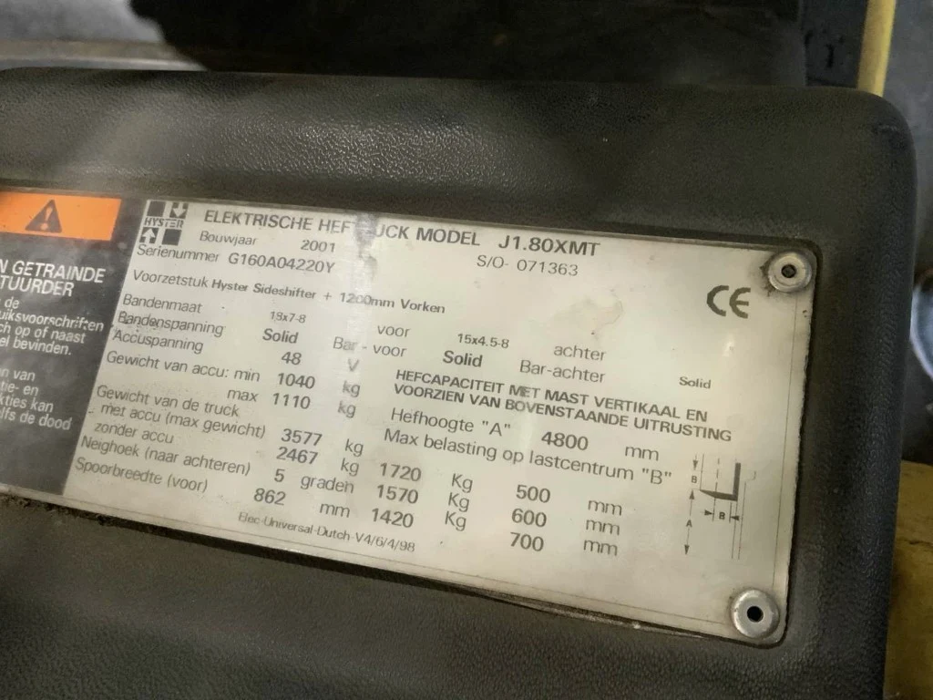 1800kg hefvermogen. Eigen gewicht= 3577kg. Volle banden. Freelift, sideshift en triple mast. Max hefhoogte= 4,8m. Vrije doorrijhoogte=2,06m. 11421 uren. Sleutel en lader aanwezig.
