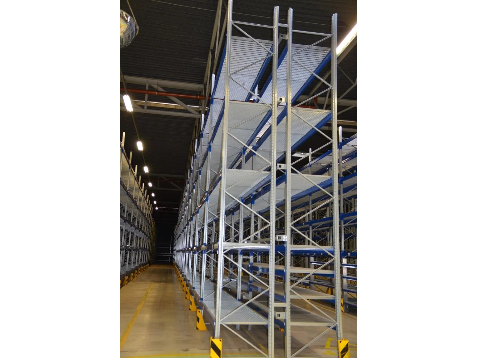 Hoogte=6000mm. 13 staanders. 120 liggers lengte=2700mm. Voorzien van roosters en aanrijbeveiliging.