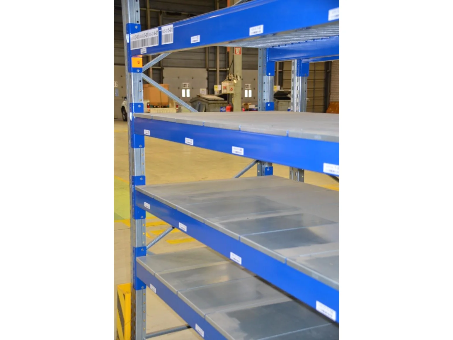 Hoogte=6000mm. 13 staanders. 128 liggers lengte=2700mm. Voorzien van stalen inlegborden, roosters en aanrijbeveiliging.