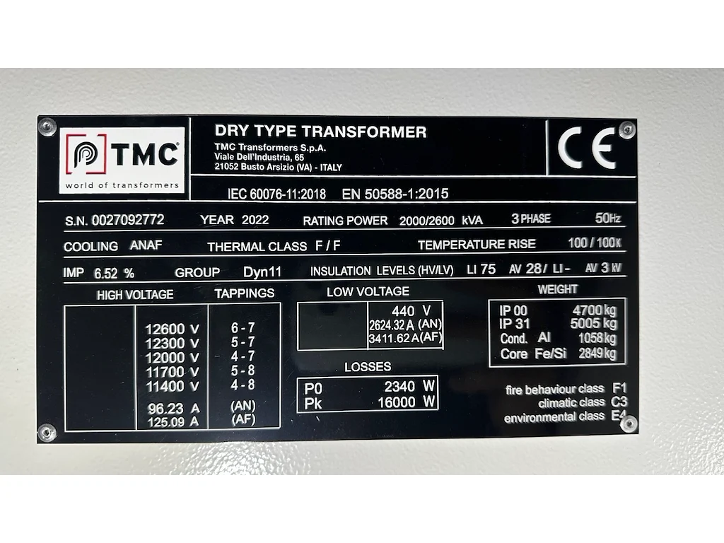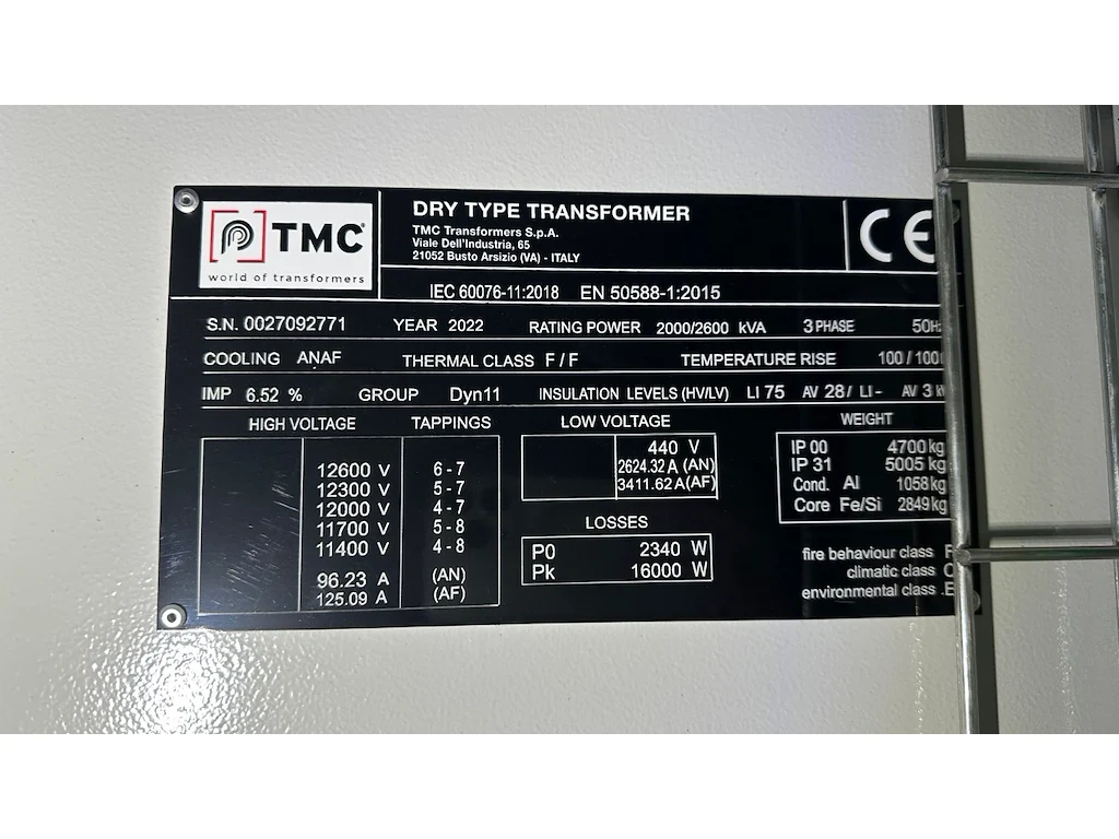 Yoc: 2018,12.3/0.44kV, 2000VA, this item can NOT be removed before the dismantling work on the coater is finished<br /> (expected date end of November)<br /> <br /> PLEASE NOTE: this lot is located on the Soliver Evergem site. Collection must be arranged by appointment.