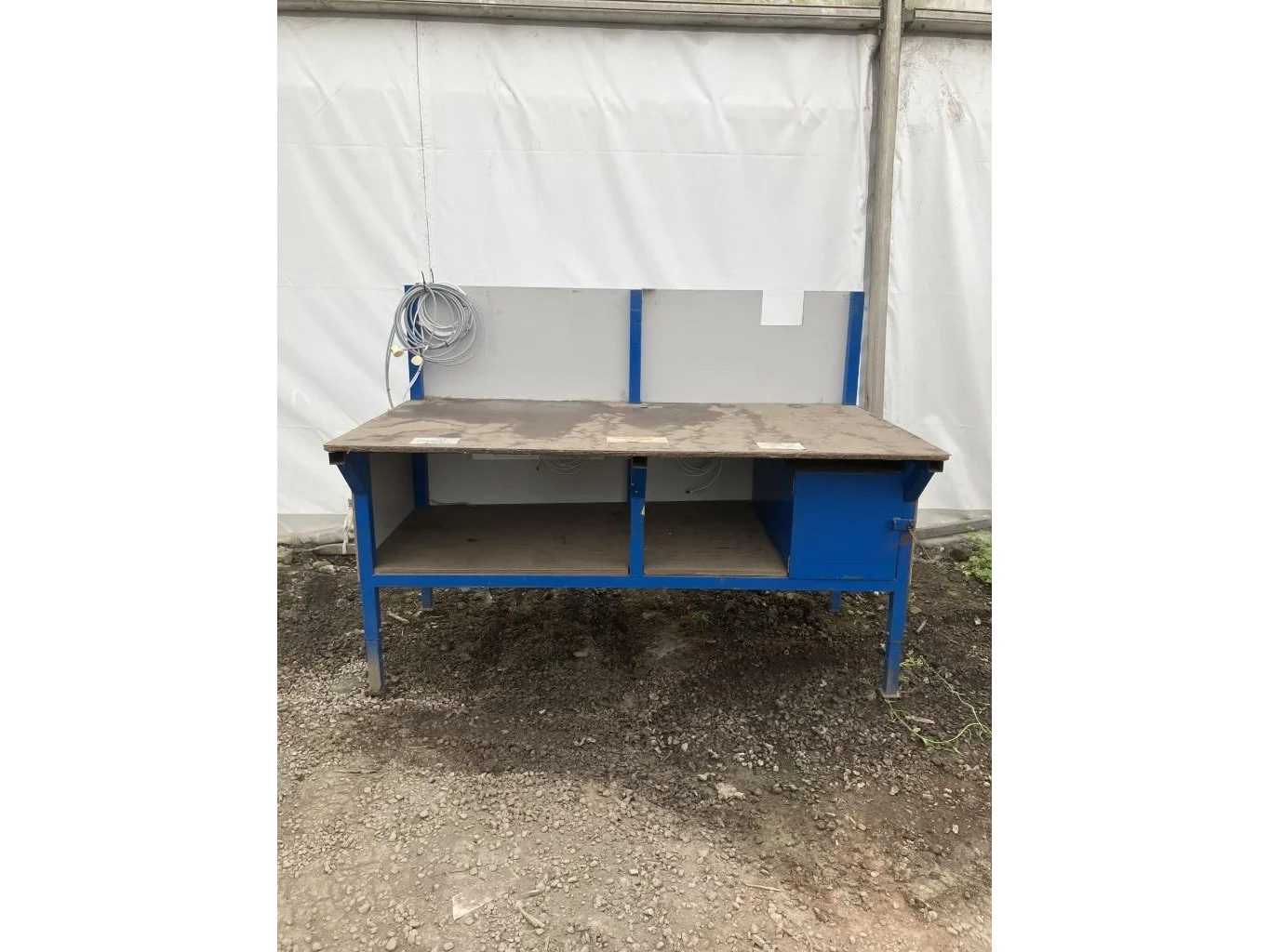 Afmetingen: L 2000mm , D 1050mm - hoogte regelbaar door verstelbare poten -Max hoogte werkblad 1000mm - Kastje: B 400mm - H 450mm - Materiaal: stalen profielen 2,5mm en betonplex platen dikte 18mm<br /> Gebruikt