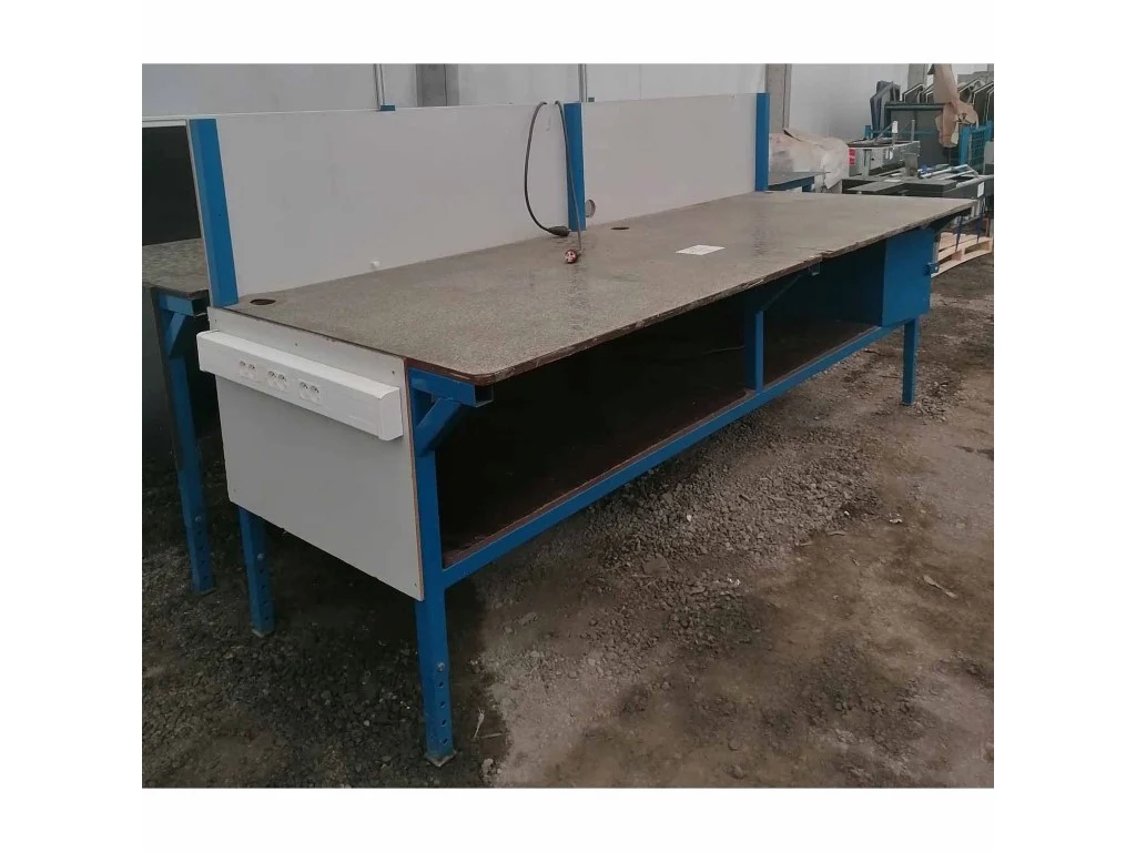 Afmetingen: L 3000mm , D 1050mm - hoogte regelbaar door verstelbare poten -Max hoogte werkblad 1000mm - Kastje: B 400mm - H 450mm - Materiaal: stalen profielen 2,5mm - werkblad en onderblad in beton plexplaten dikte 18mm - achter-en zijplaten in fineer<br /> Gebruikt