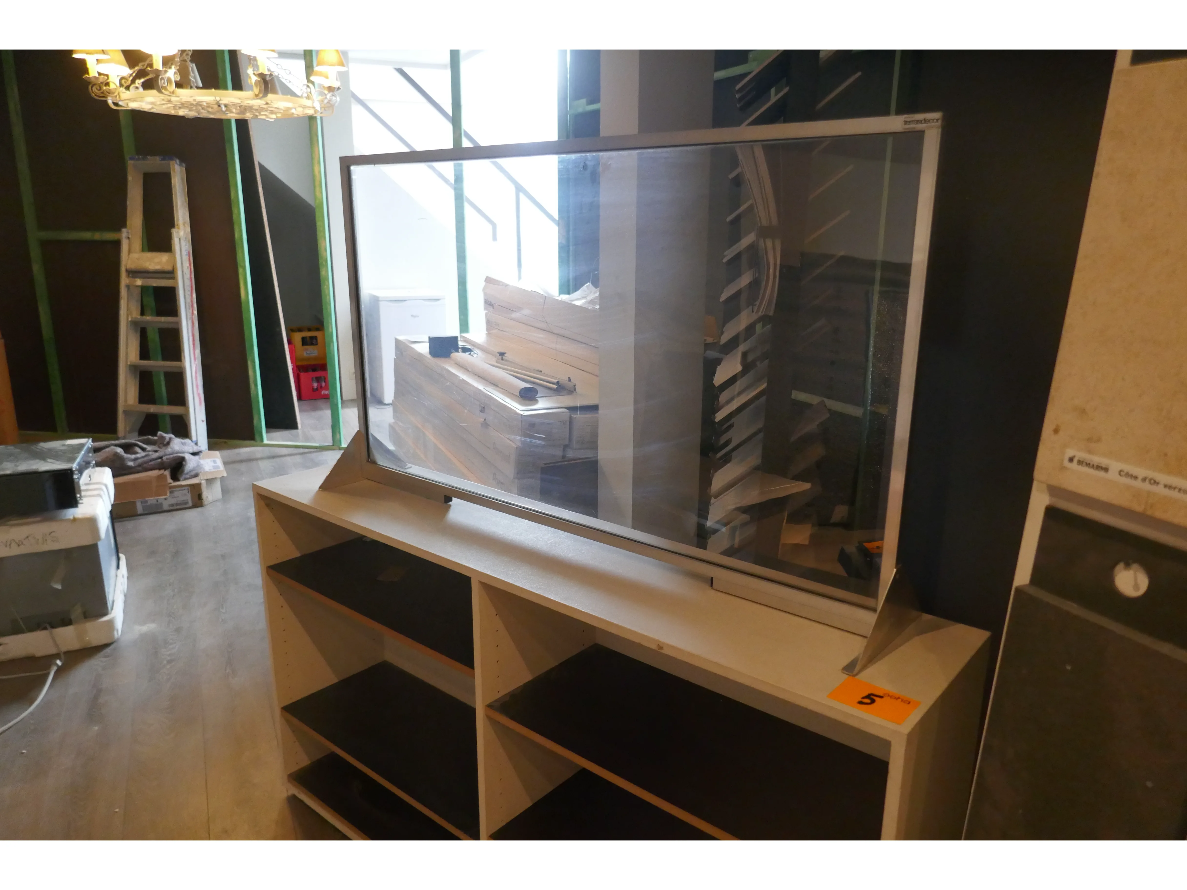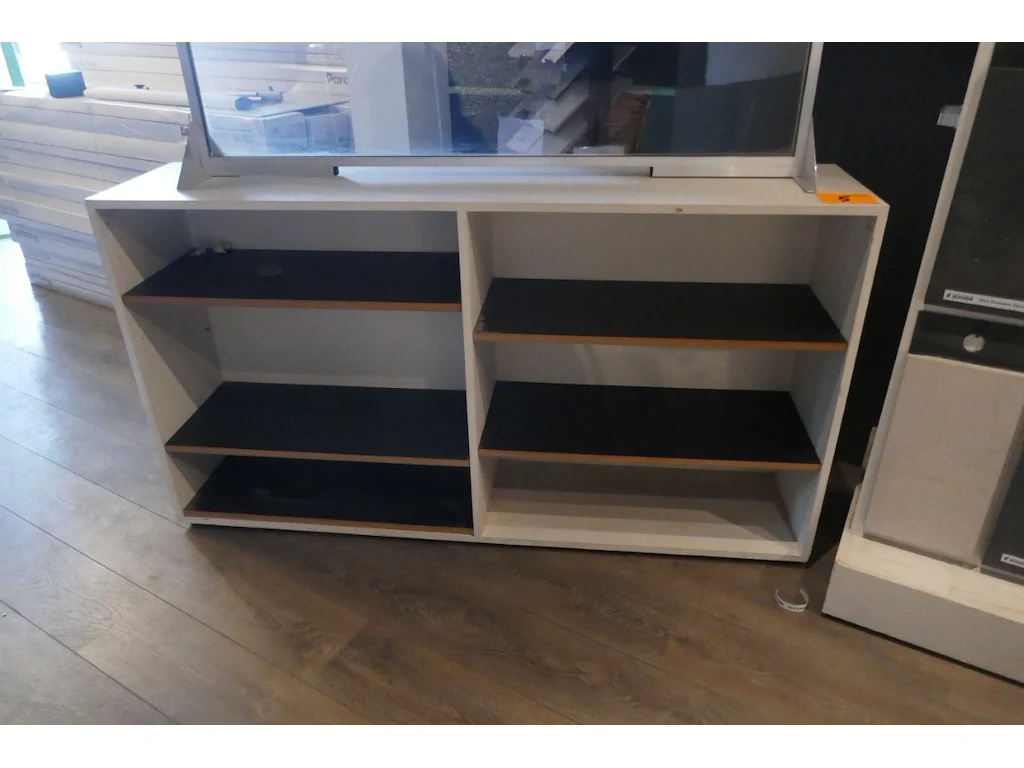 Houten open kast met legborden + plexyglas scherm <br /> *afmeting kast : L155xB35xH85 cm