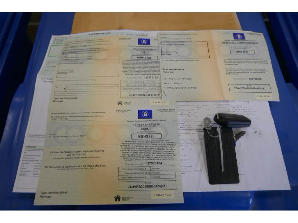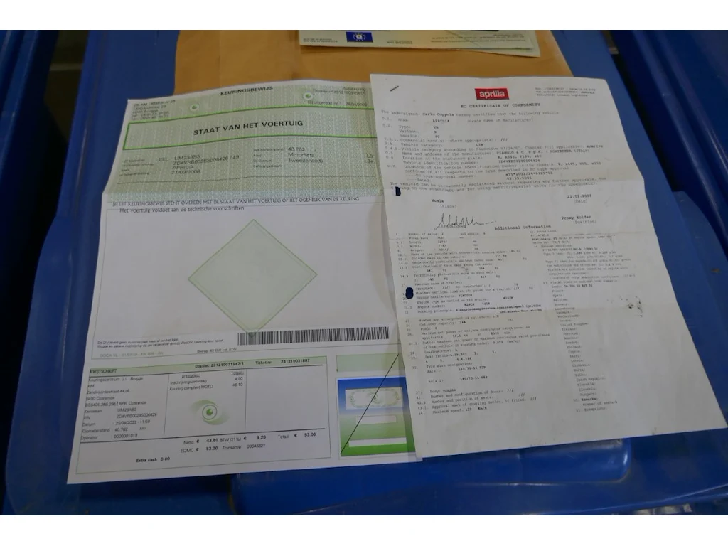 Motorfiets<br /> *merk : APRILIA<br /> *model : scarabeo 250<br /> *type : VR<br /> *chassisnr : zd4 vrb 002 8s 006 426<br /> *kmstand : 40762 km ( op keuringbewijs )<br /> *1ste inschrijving : 21/3/2008<br /> *motorinhoud : 244 <br /> *brandstof : benzine<br /> *motorvermogen : 17KW<br /> *max snelheid : 125<br /> *milieuklasse : euro 3<br /> *Met sleutel en bijhorende boorddocumenten<br /> (keuringbewijs : 2023)<br /> *Lichte schade zijspiegel