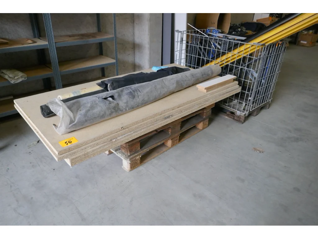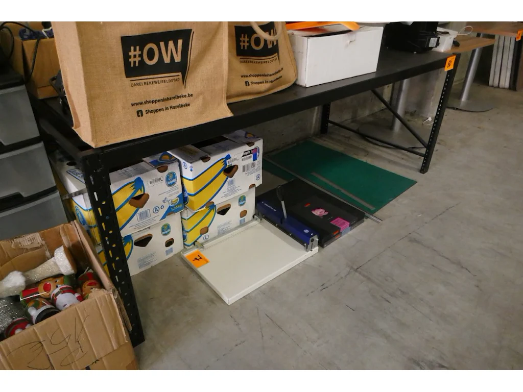 Reeks van edemonteerde lage metalen rekken of werktafels ( zie foto's ) - diverse steunen en legborden<br /> + 2 metalen rekken met legborden <br /> (Opgelet!! Gitterbox is niet bij dit lot)
