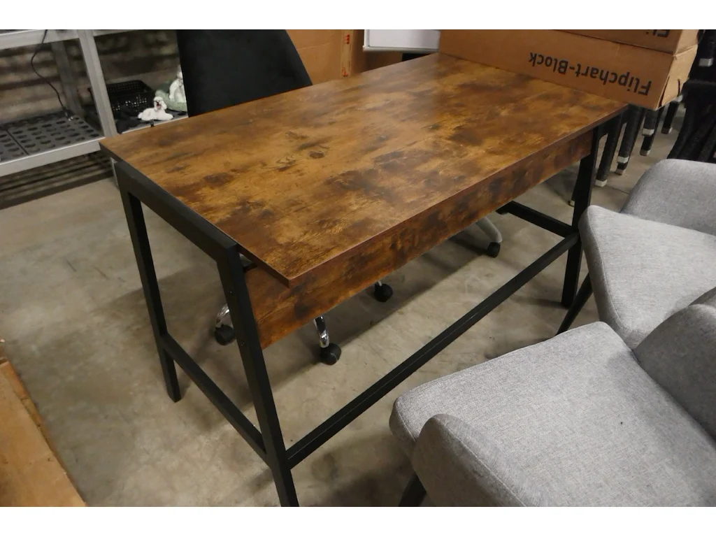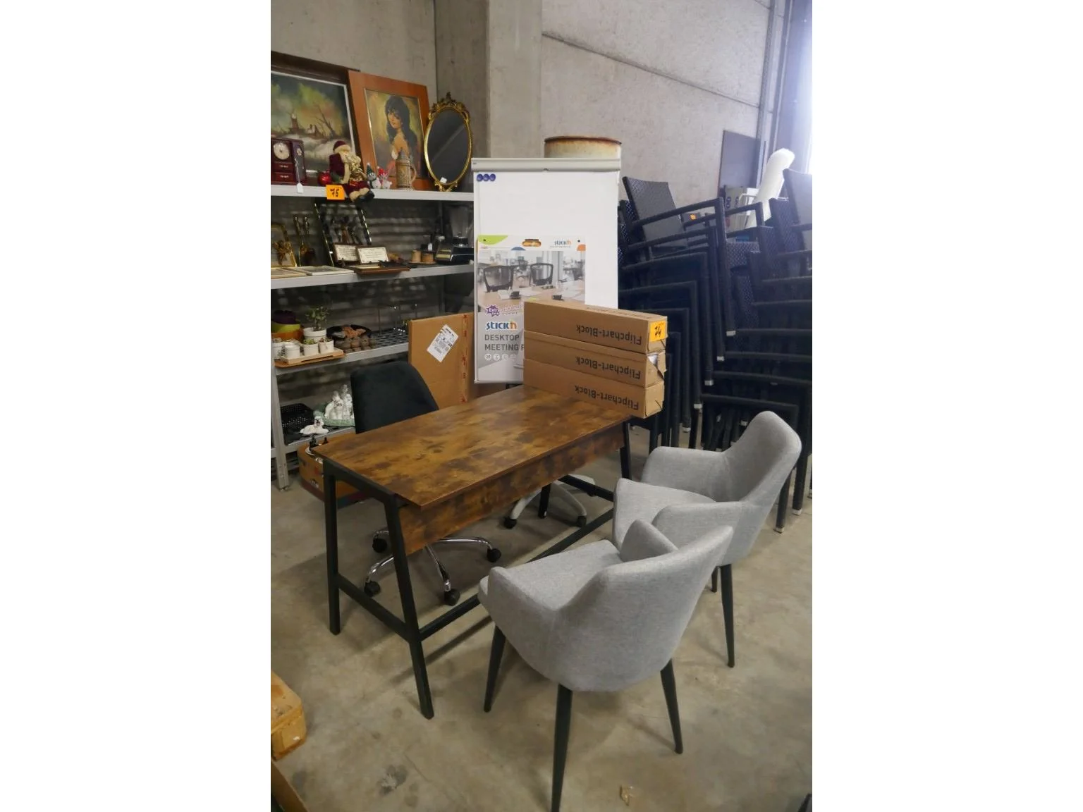Complete bureau, bestaande uit = <br /> Bureautafel - 2 bezoekerszetels, grijze stofbekleding - verrijdbare bureelstoel, zwarte stofbekleding - magneetbord - vergaderbord + rollen papier