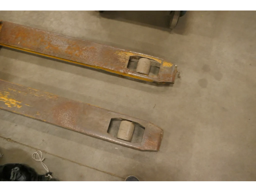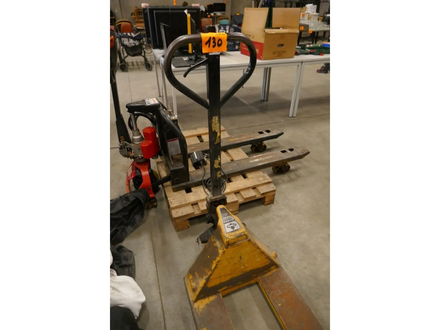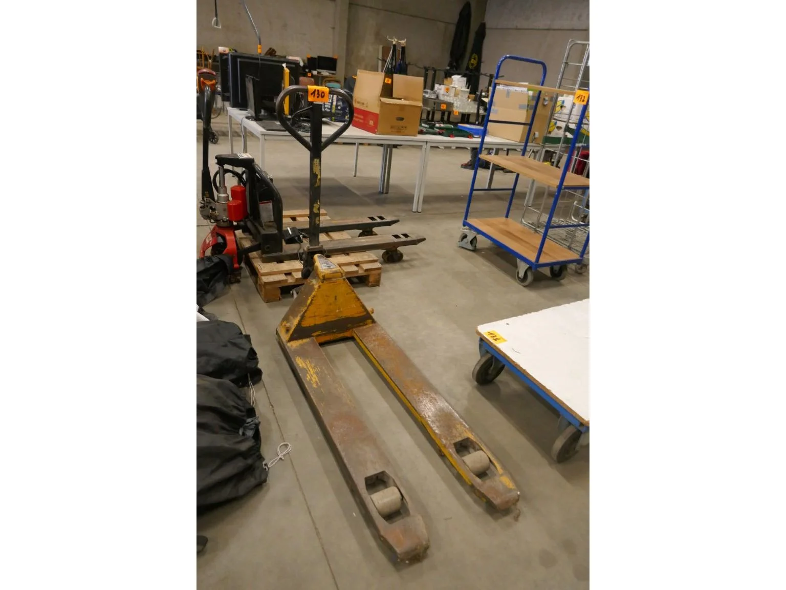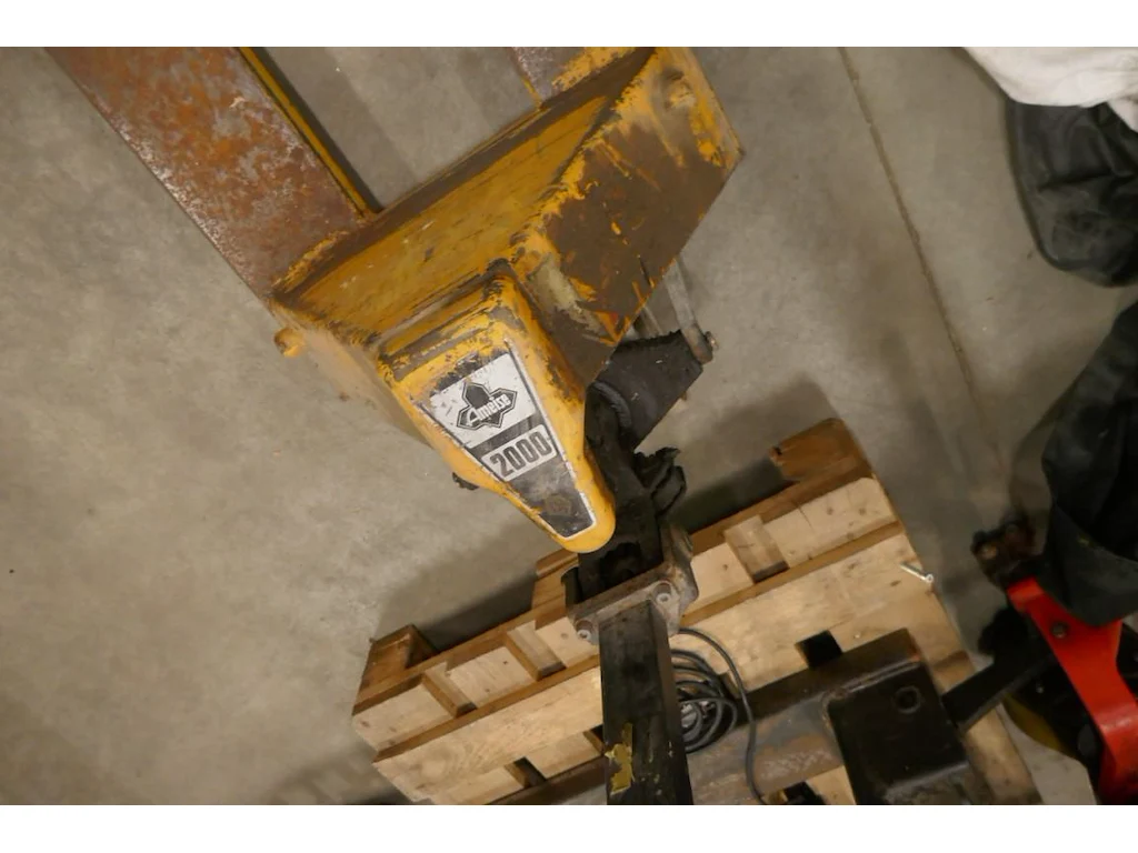 Transpallet gele kleur<br /> *merk : AMEISE<br /> *cap : 2000 kg<br /> Na te zien
