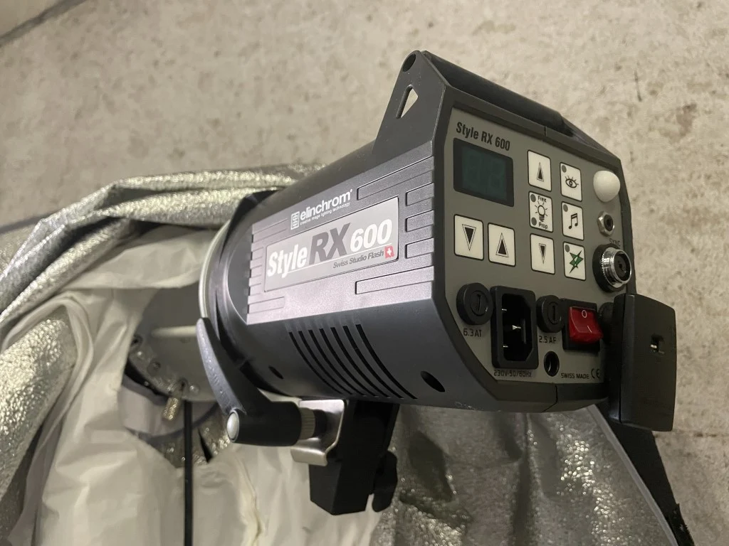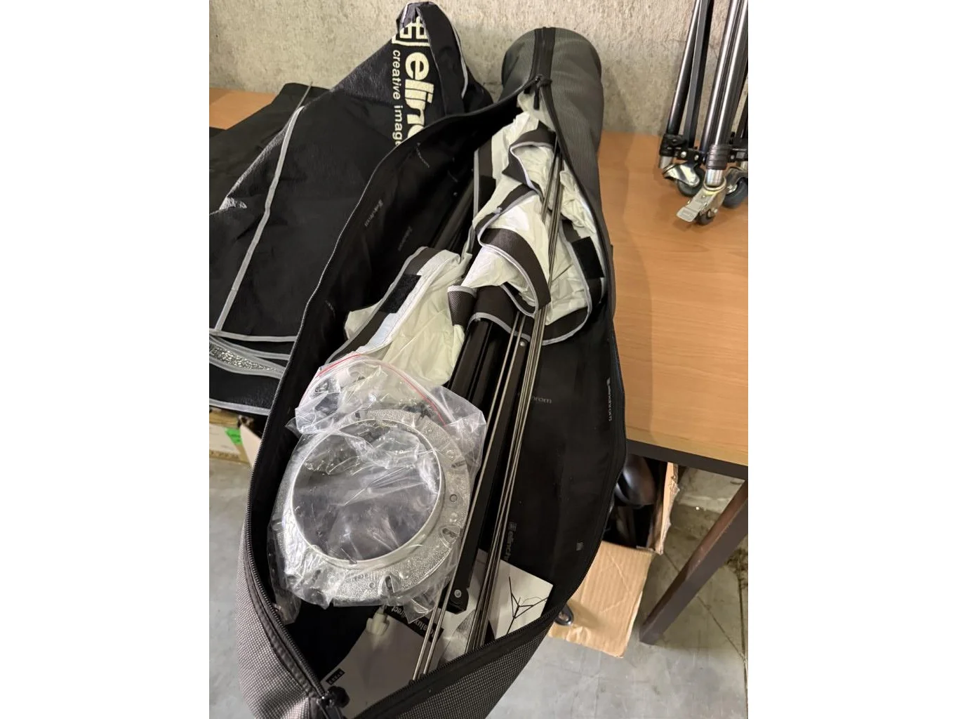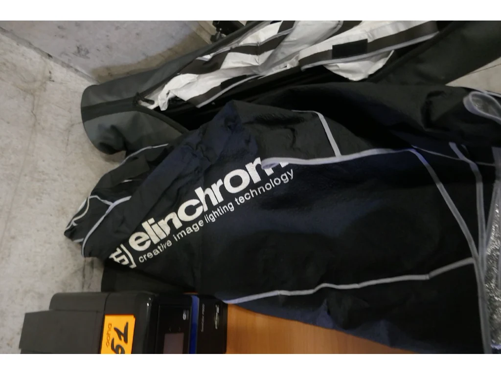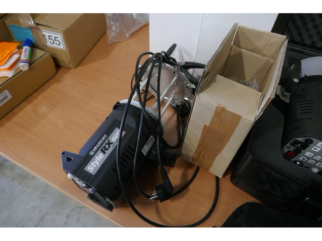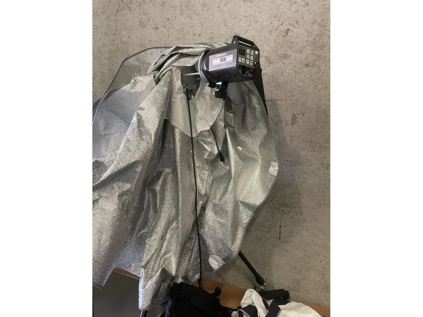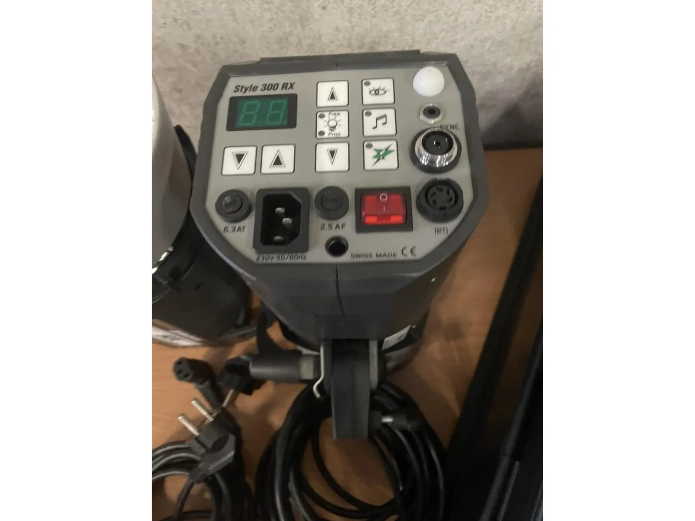 Set van 3 studioflitsers met bijhorende onderdelen<br /> *merk : ELINCHROM<br /> *model : style RX300 + RX600<br /> *met koffer <br /> +<br /> Flits paraplu ,3 statieven (oa 1 verrijdbaar) <br /> *ELINCHROM<br /> *met bijhorende draagzakken