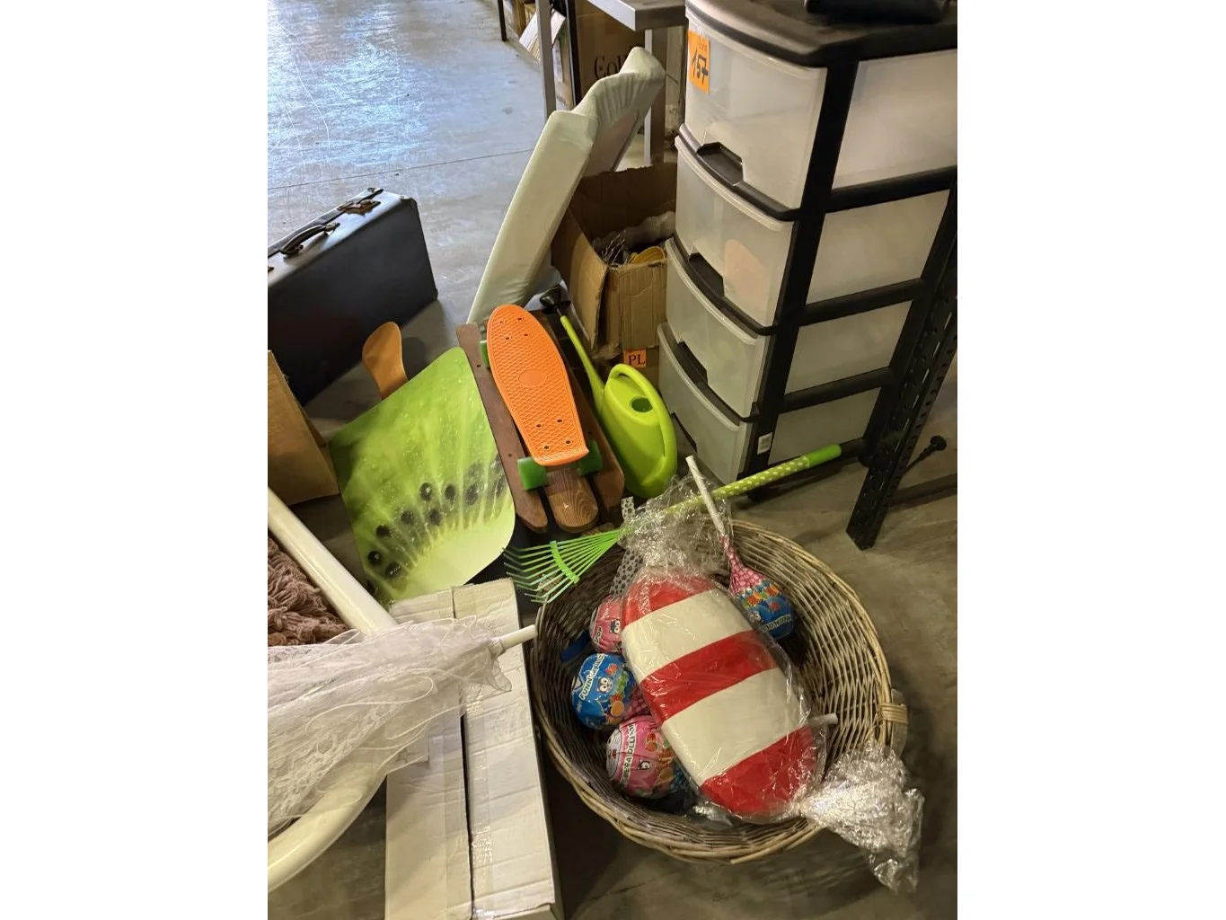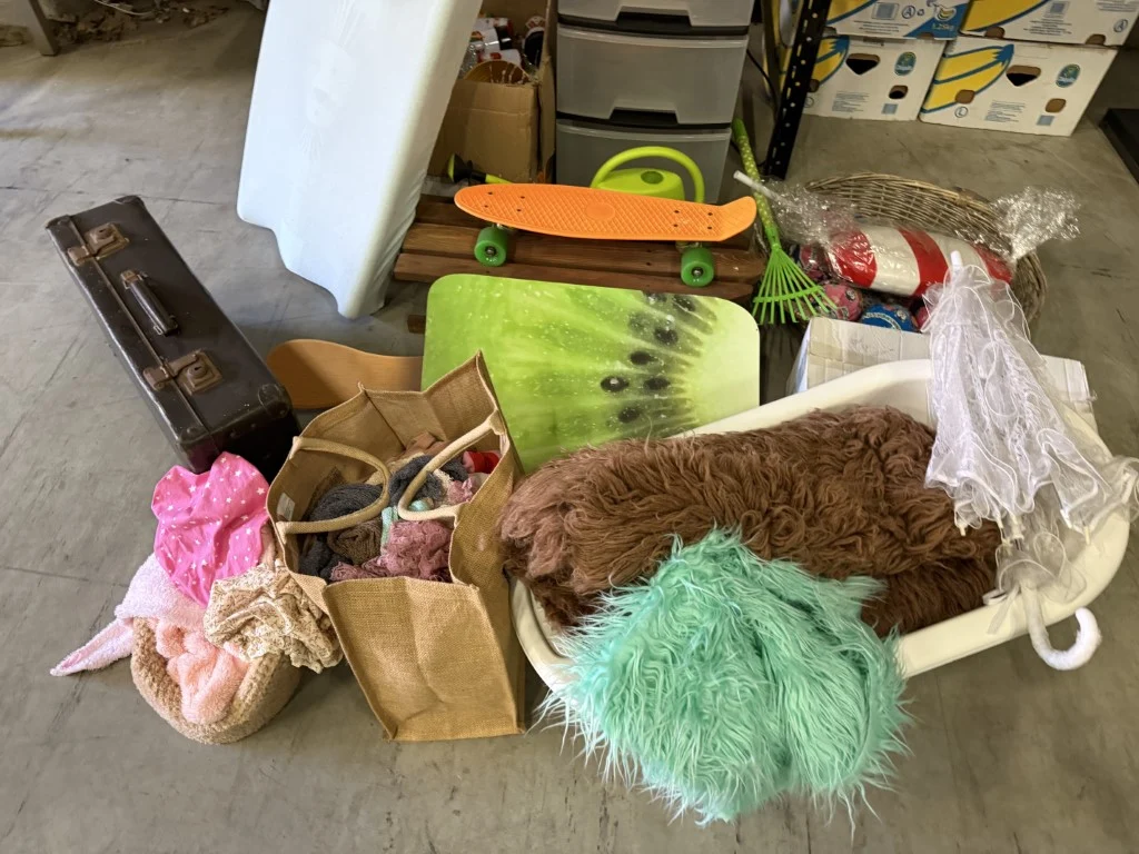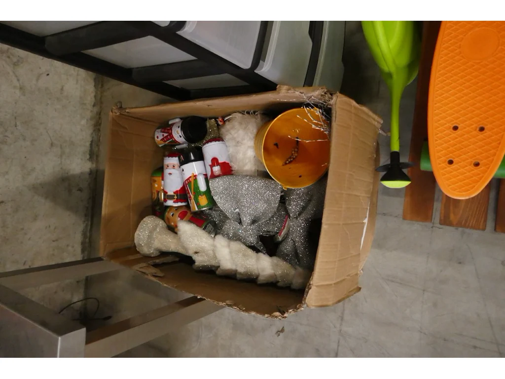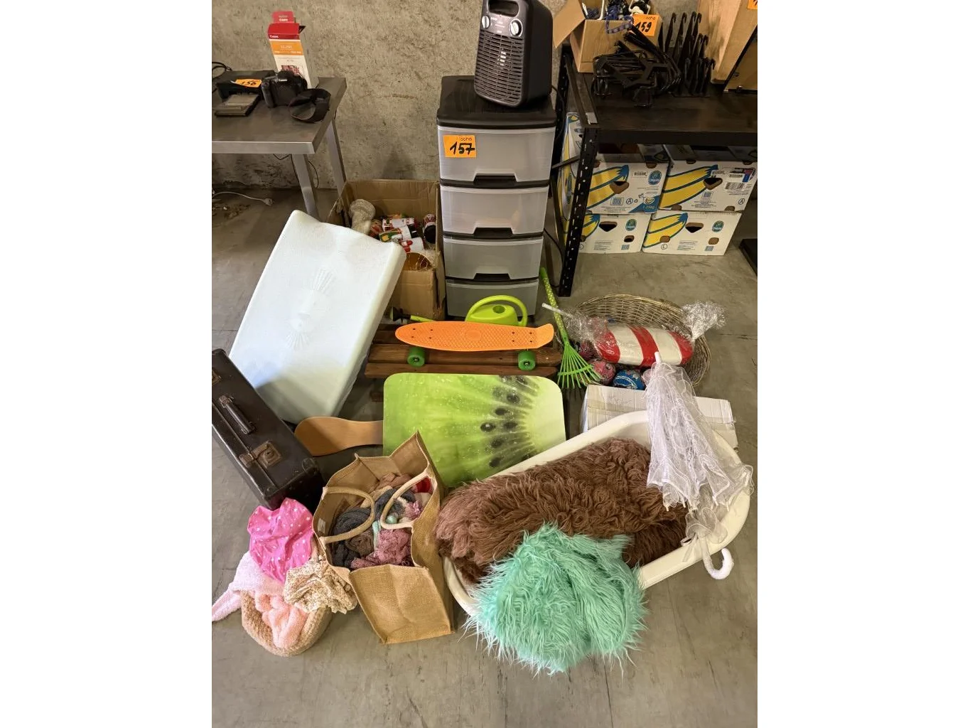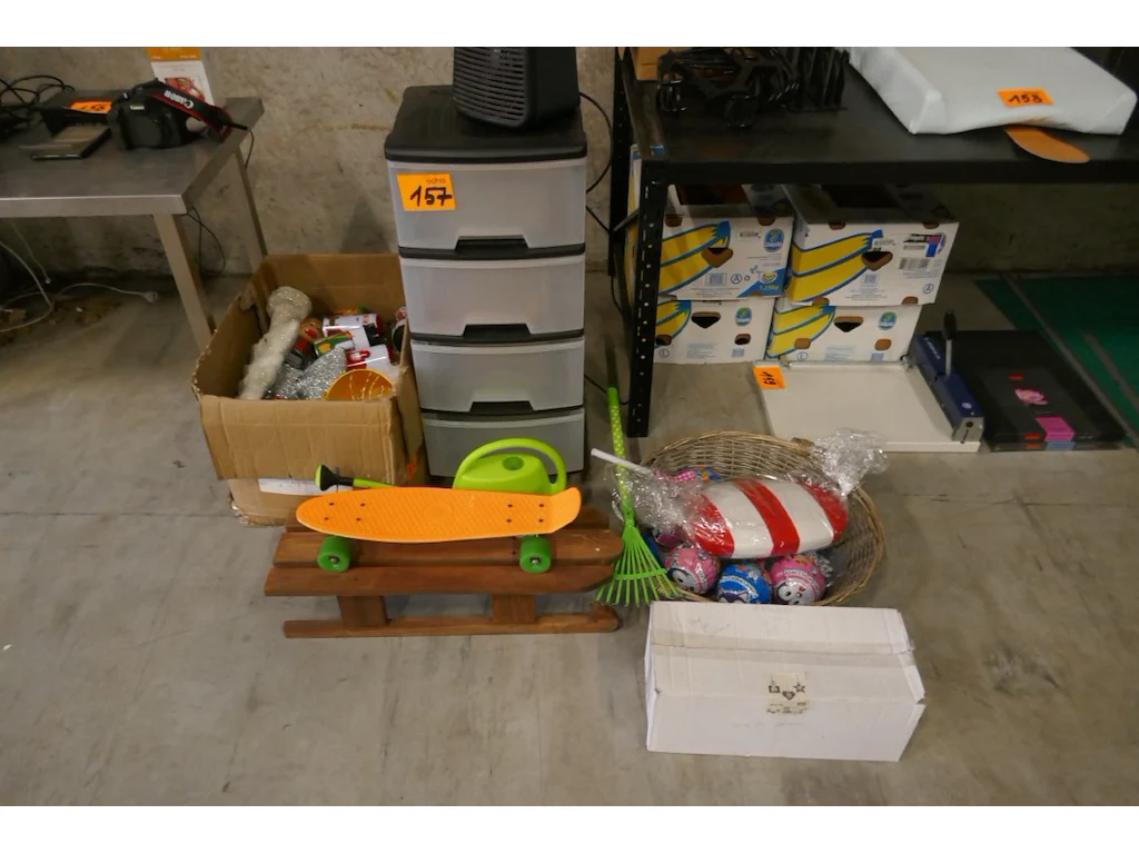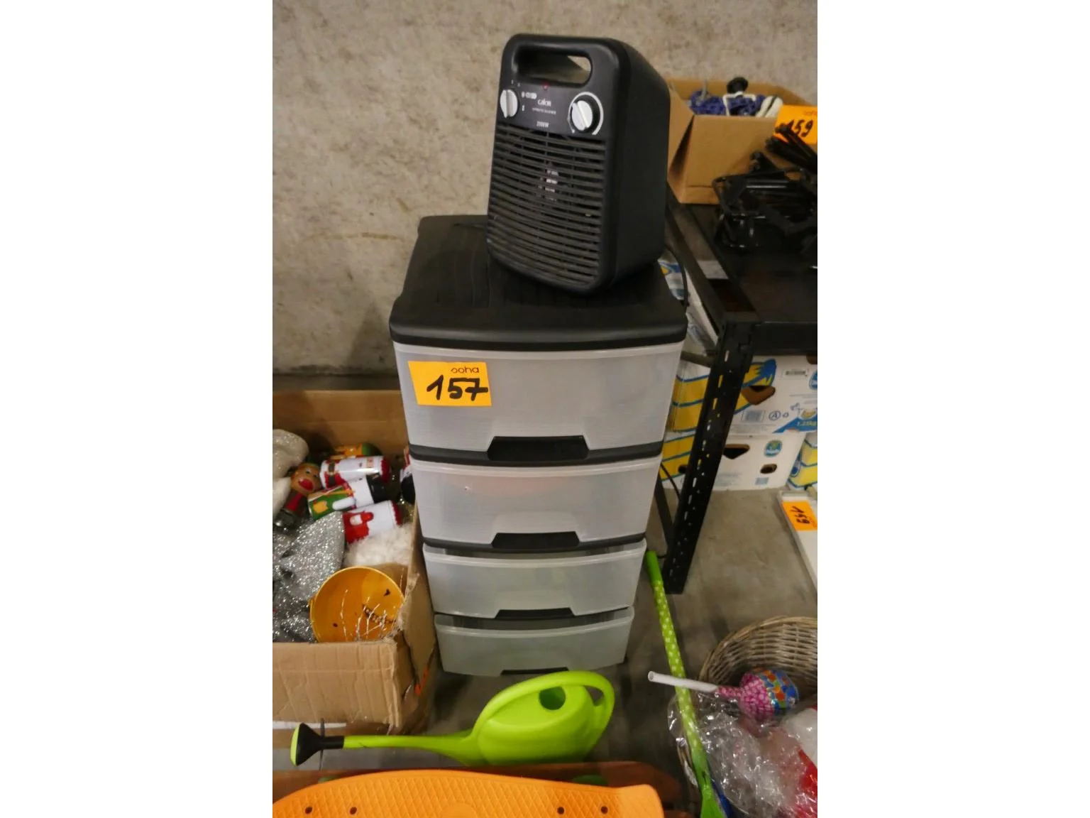Plastieken Opbergbox 4 laden - el.verwarmingstoestel CALOR - skatebord - slede - kerstartikelen - gieter - badje - vintage valies - textief (sjaals, mutsen) - parasol, … enz….