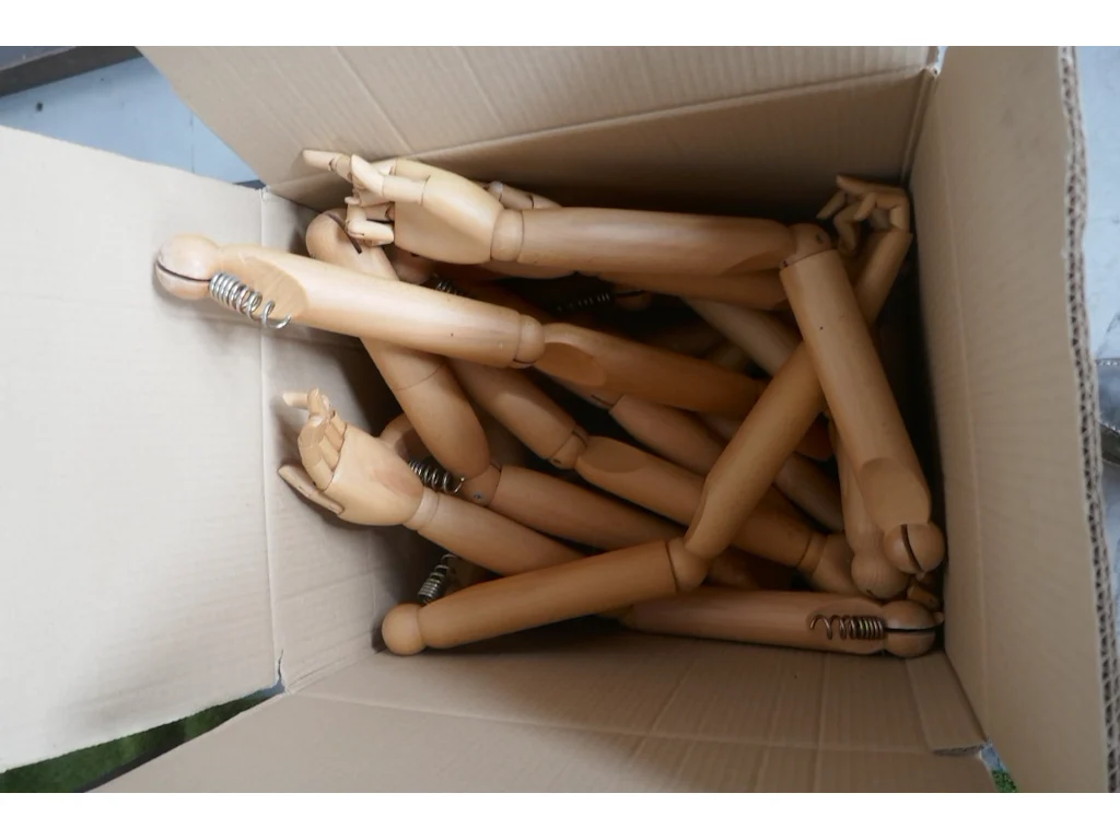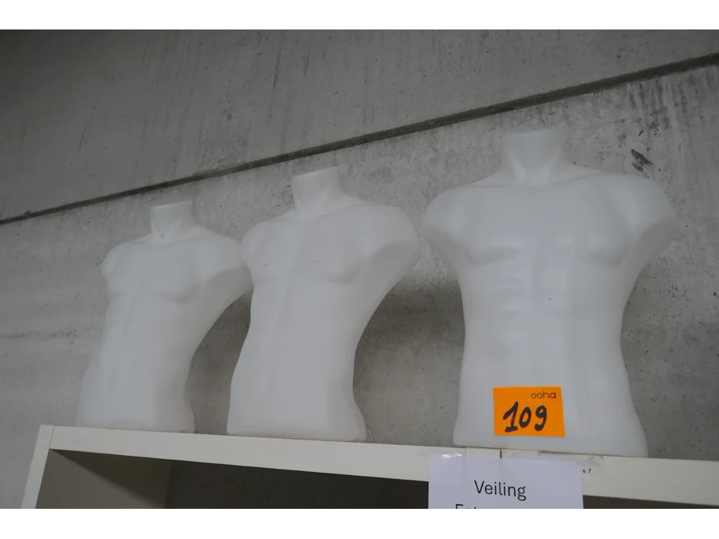 Etalage poppen op metalen voet met bijhorende houten ledenmaten - 2 stuks<br /> Plastieken etalage poppen mannen - 3 stuks