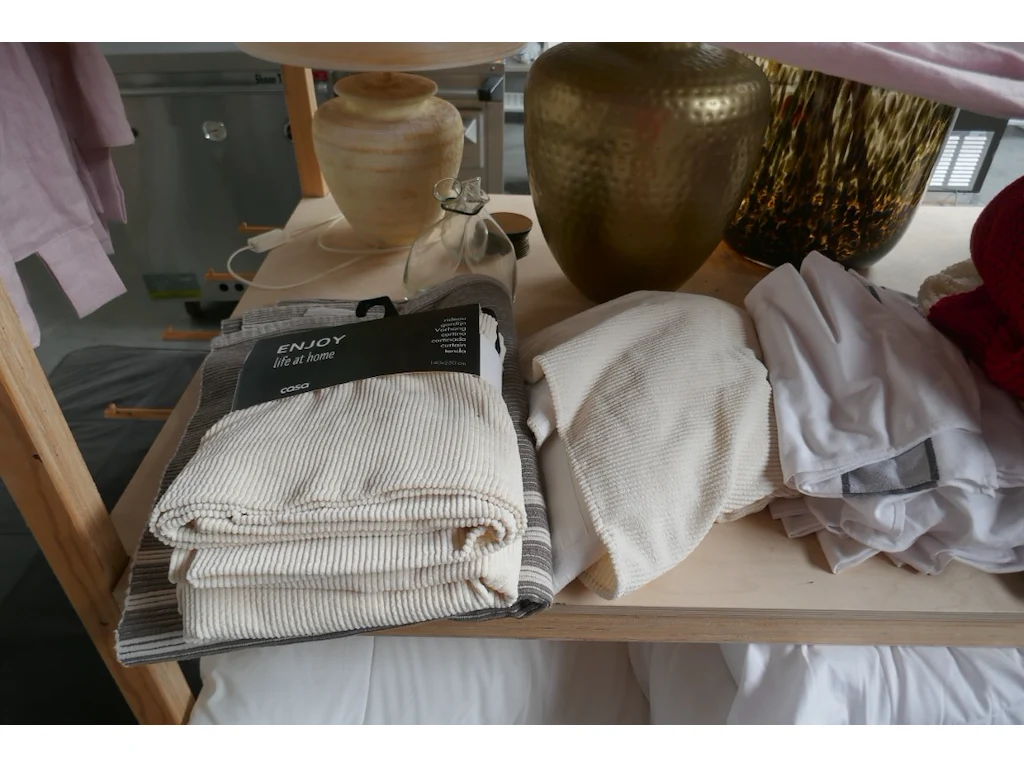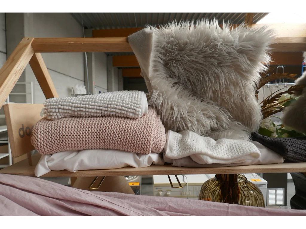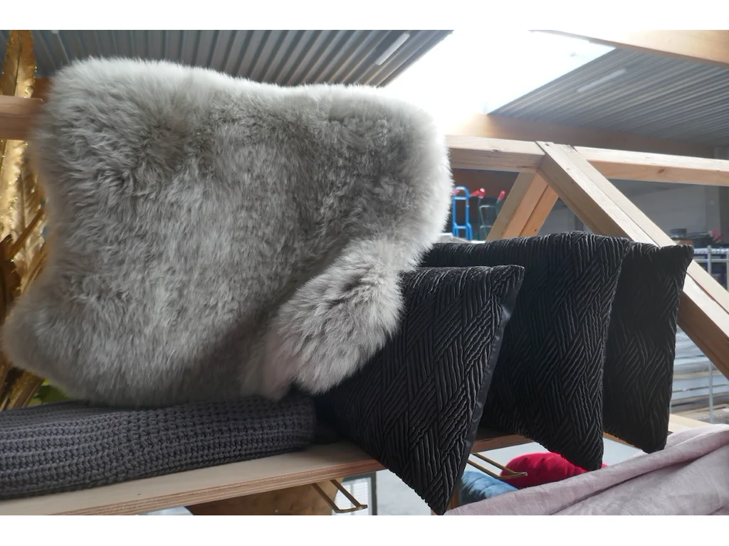 Zwarte kussens - dierenhuid vloermatjes - gebreide stoffen diverse kleuren - diverse gordijnen - enz….