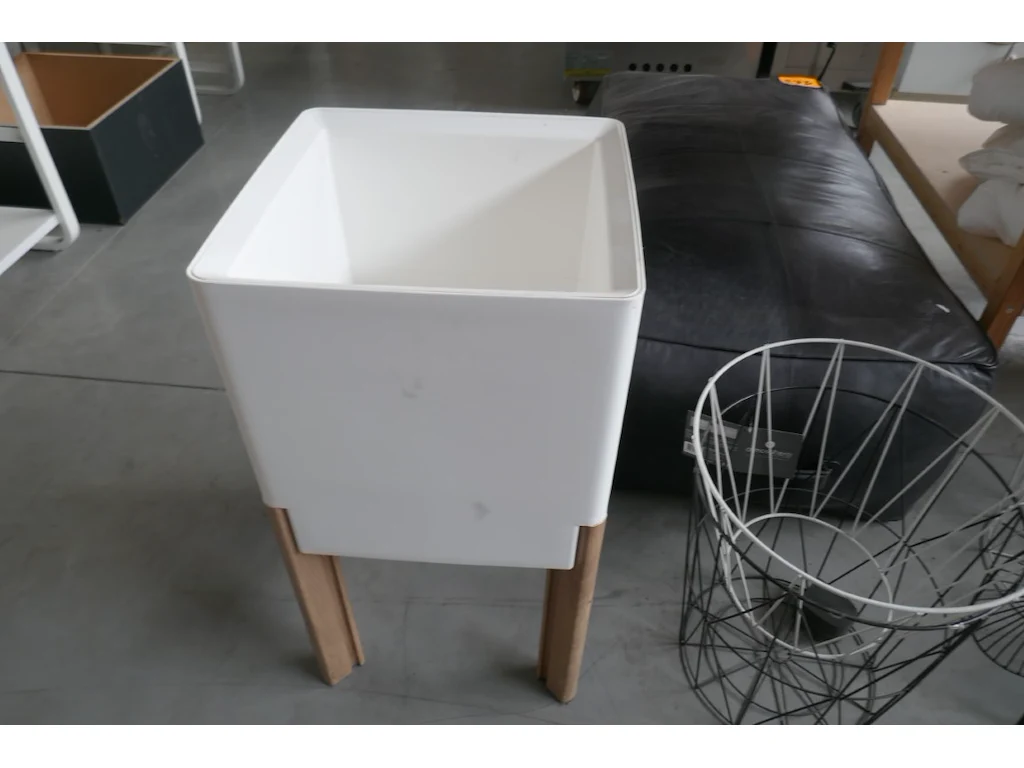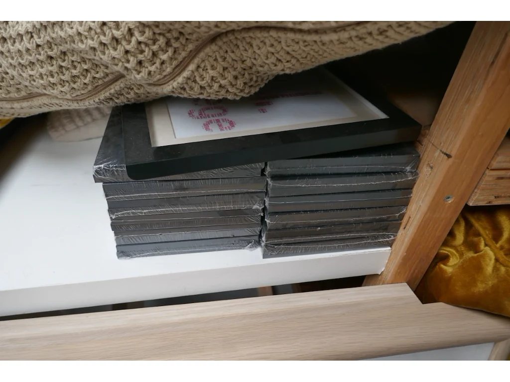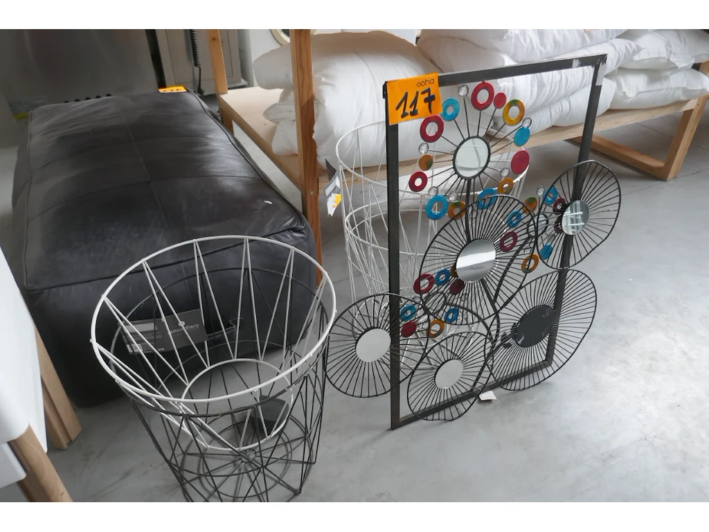 Glazen vaas met kunstoffen bloemenboeket<br /> Houten vaas met plastieken rozen <br /> Tafellamp + goudkleurige vaas <br /> Wandversiering + plastieken bloembakje + lege kaders