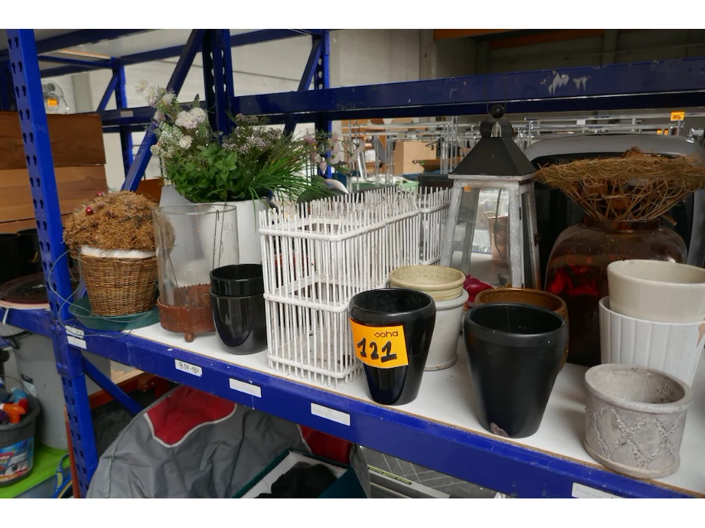 Reeks bloempotten - lantaarn - sierstuk - schaal met bloempot en kunststof boeket