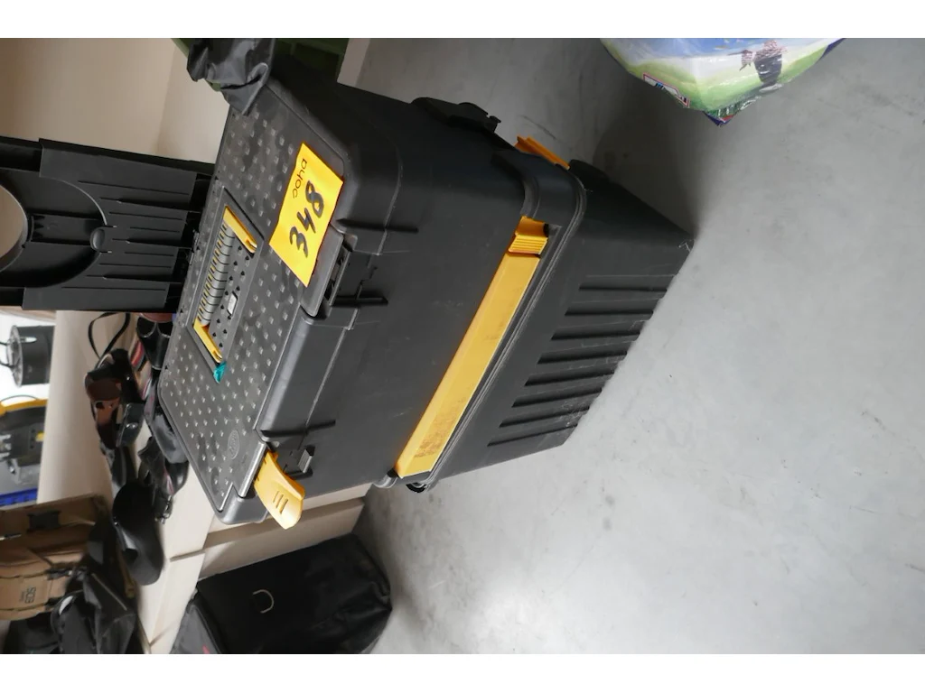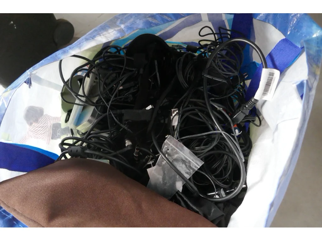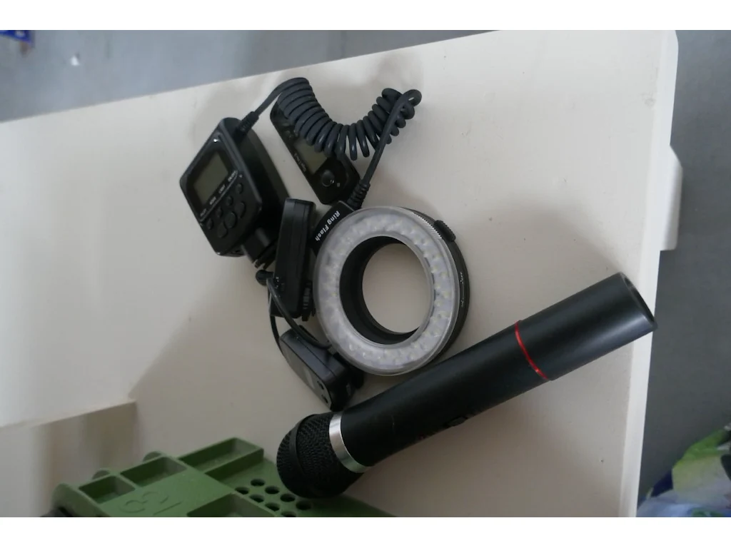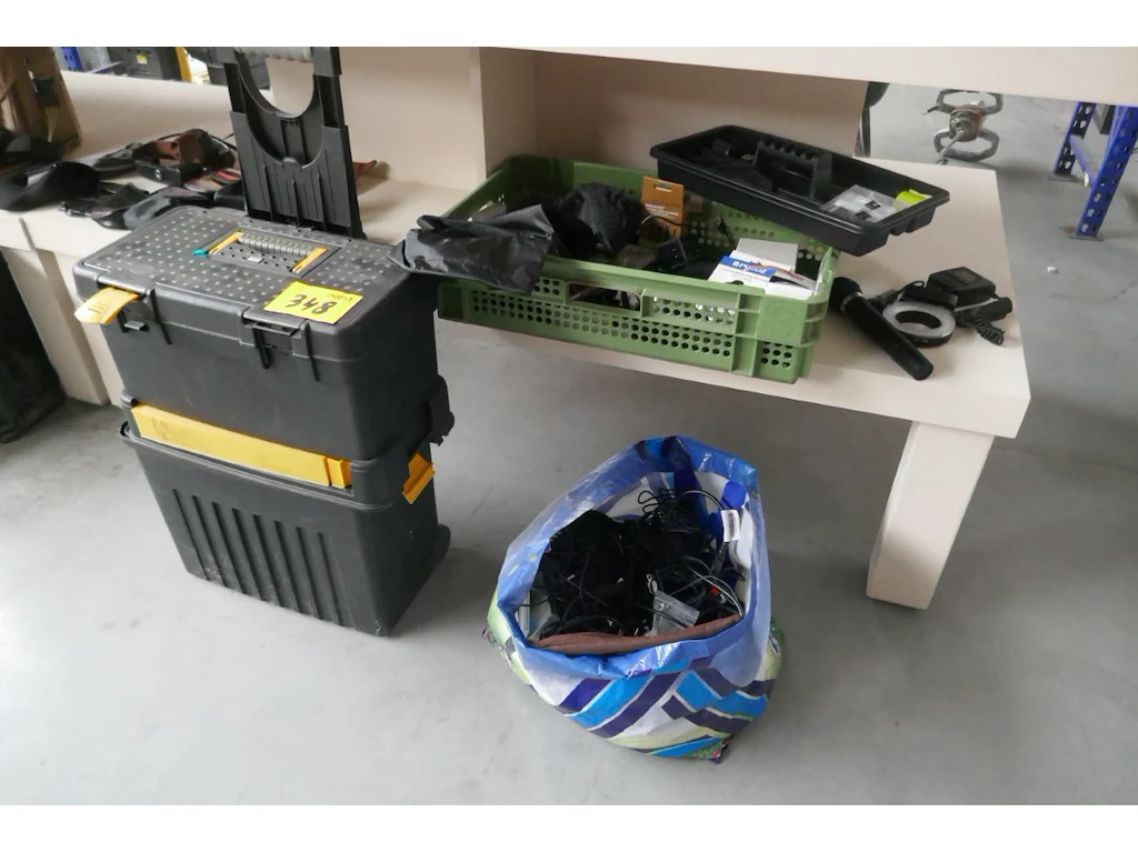 Mobiele materiaalkoffer - plastieken mand met onderdelen fotografie - microfoon - allerhande kabels voor aansluitingen