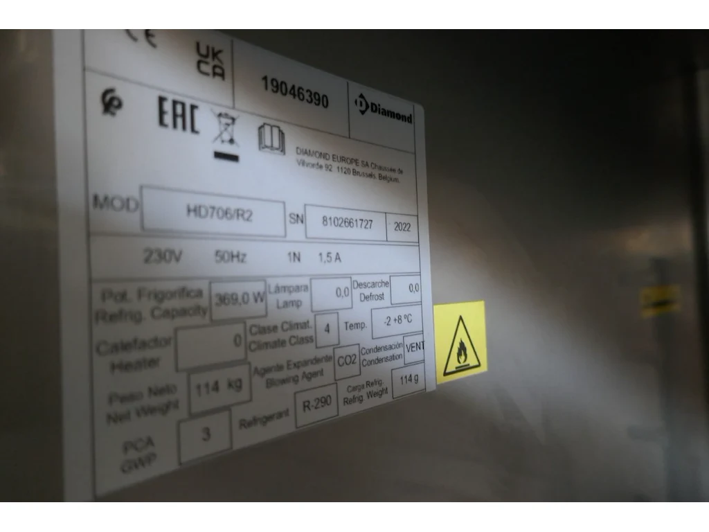 RVS Horeca koelkast geforceerd<br /> *merk : DIAMOND<br /> *model : hd706/r2<br /> *inhoud : 550 L<br /> *bouwjaar : 2022