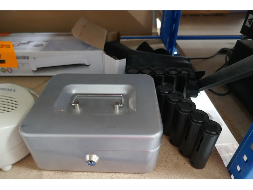 Elektrische laminator met bijhorende sheets<br /> *merk : SIGMA <br /> Geldkistje met munthouders