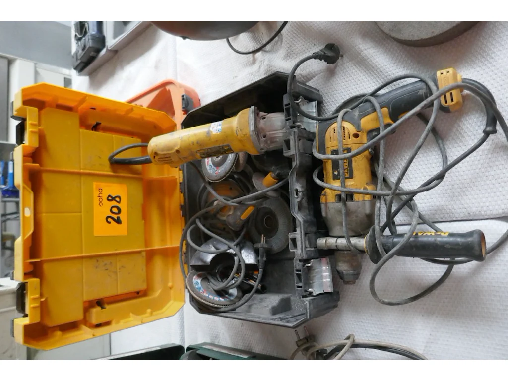 Elektrische slijper met koffer en slijpschijven<br /> *merk : DEWALT<br /> *model : niet zichtbaar<br /> Elektrische boormachine<br /> *merk : DEWALT<br /> *model : DWD 2….