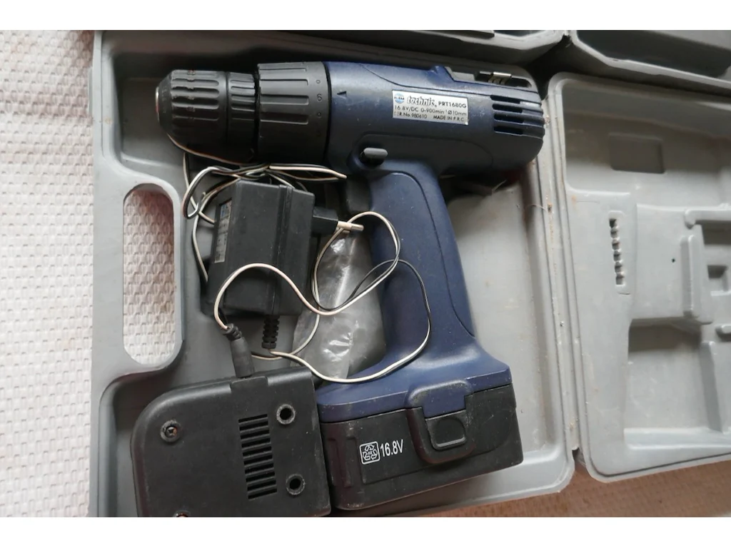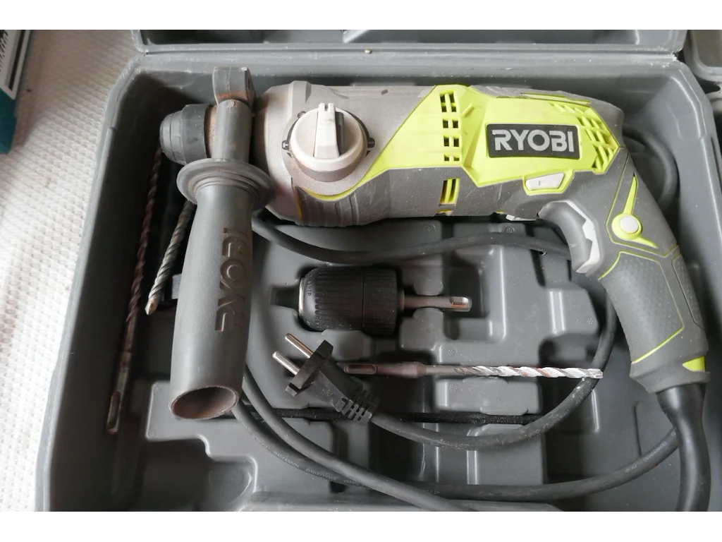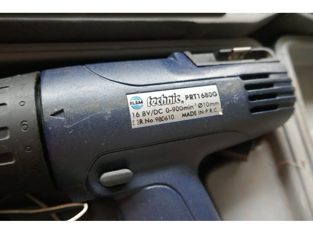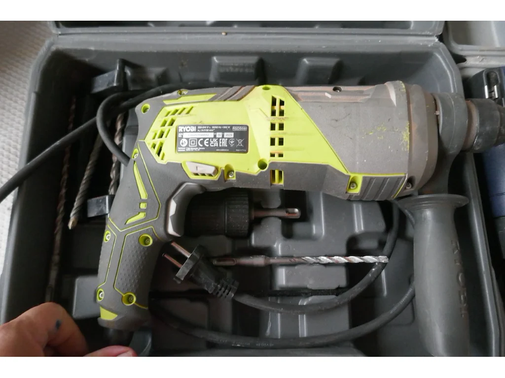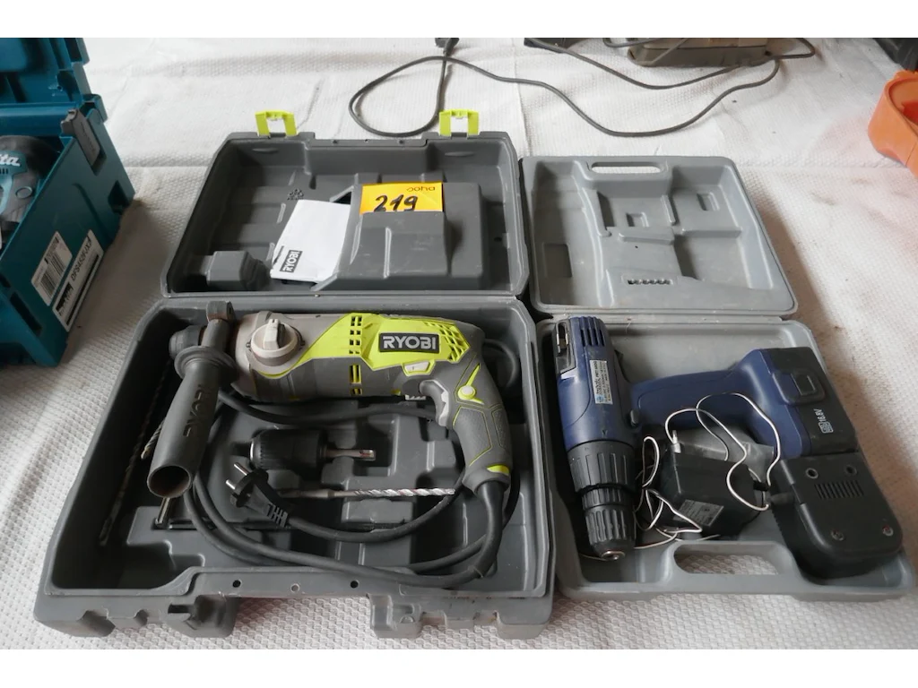 Elektrische boormachine met koffer<br /> *merk : RYOBI<br /> *model : rsds680<br /> accu schroefmachine met lader en koffer<br /> *merk : TECHNIC<br /> *model : prt1680g