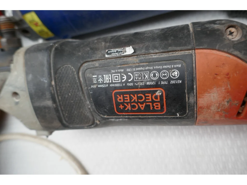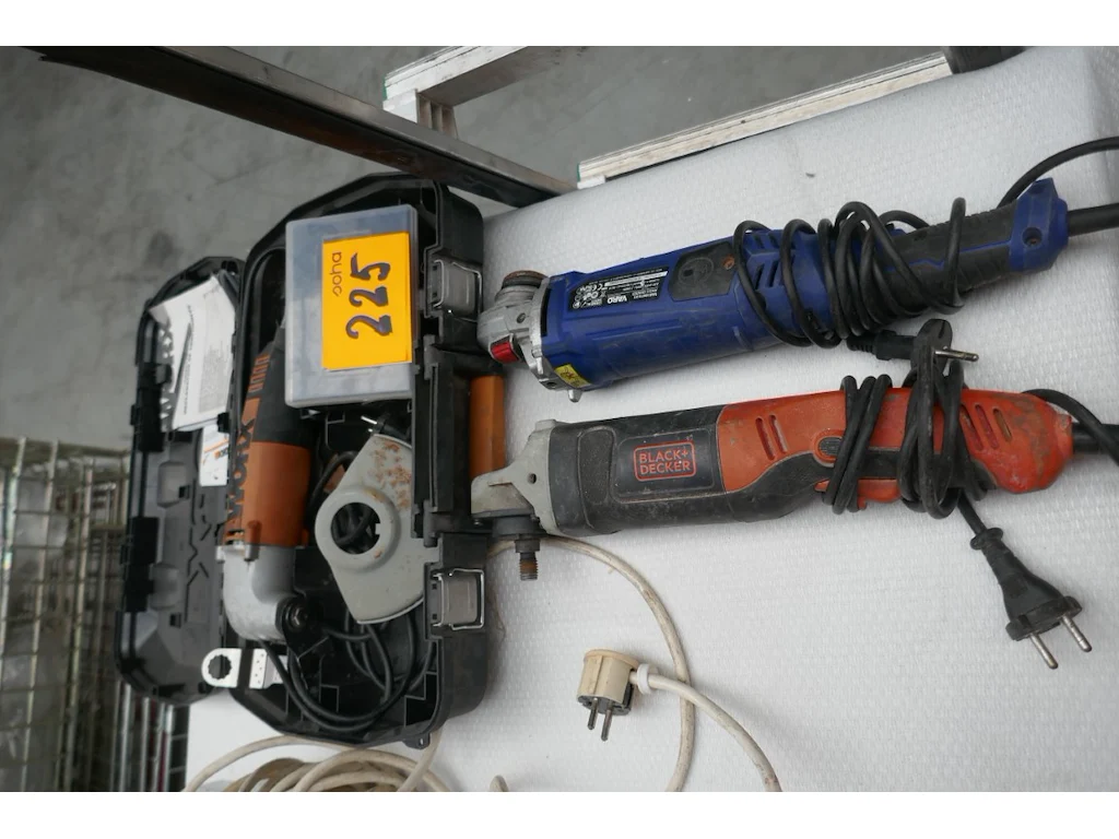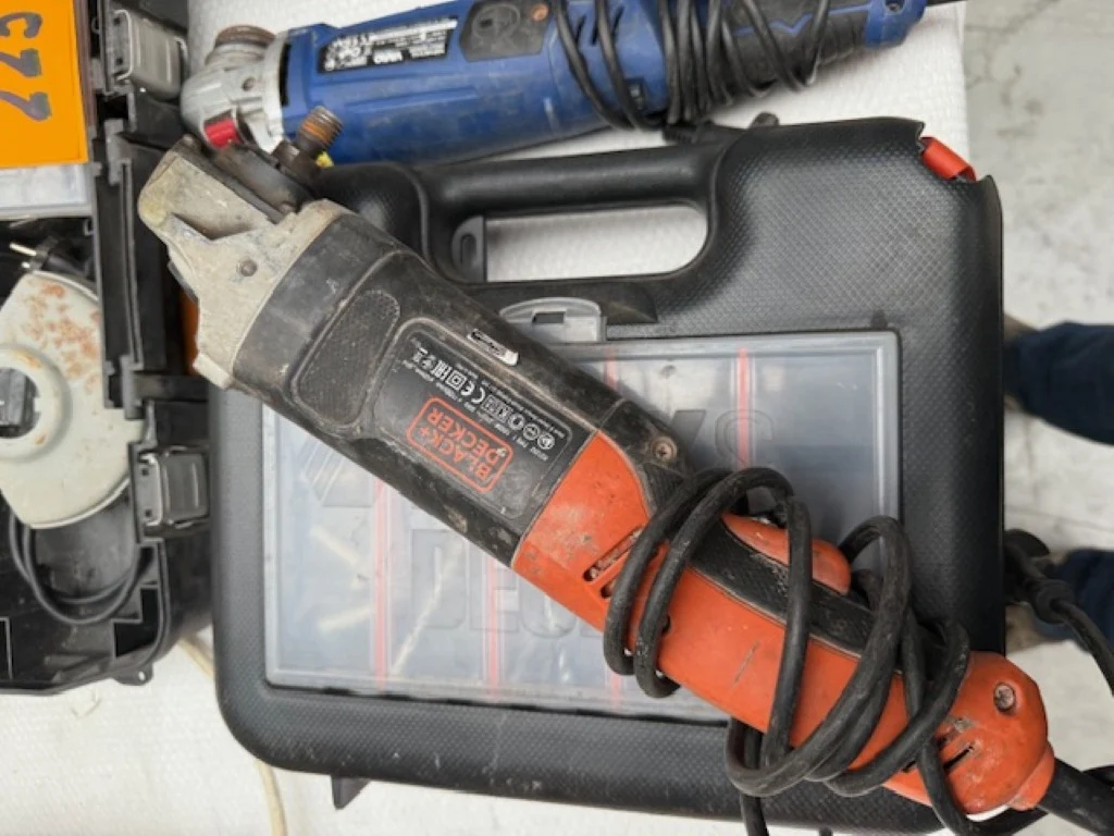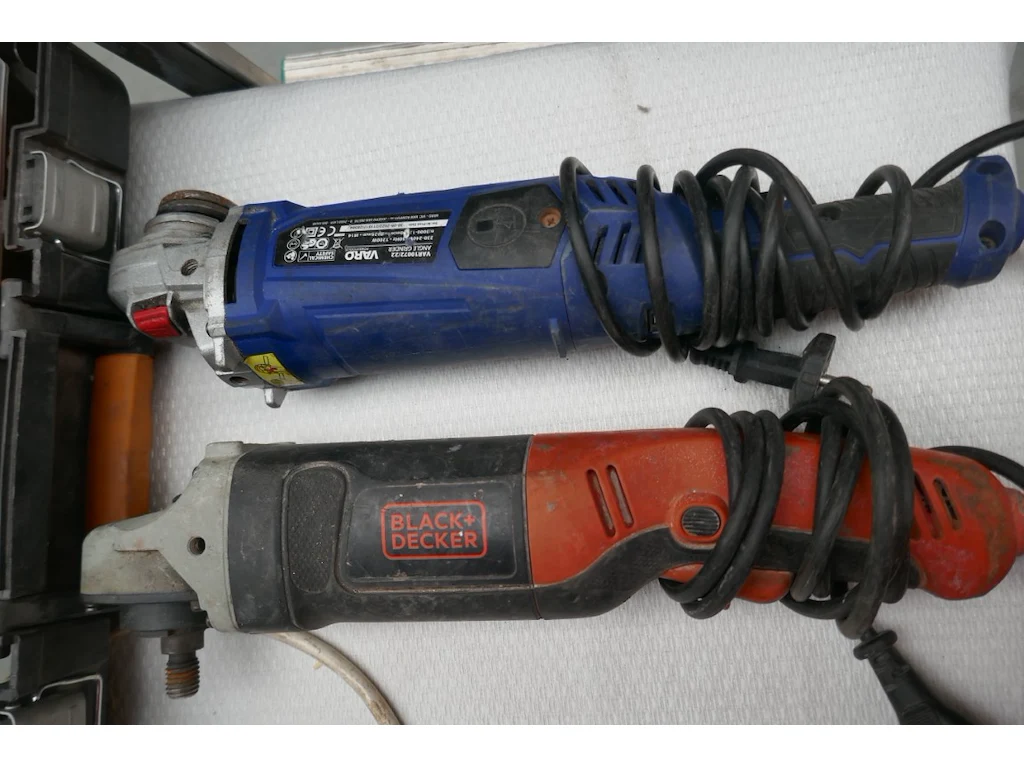 Zo goed als nieuwe el.boormachine, merk BLACK & DECKER + detector <br /> + 3 Elektrische slijpmolens<br /> *merken : Black & DECKER / VARO / WORKX<br /> *modellen : 1755 / var10072-22<br /> *koffer