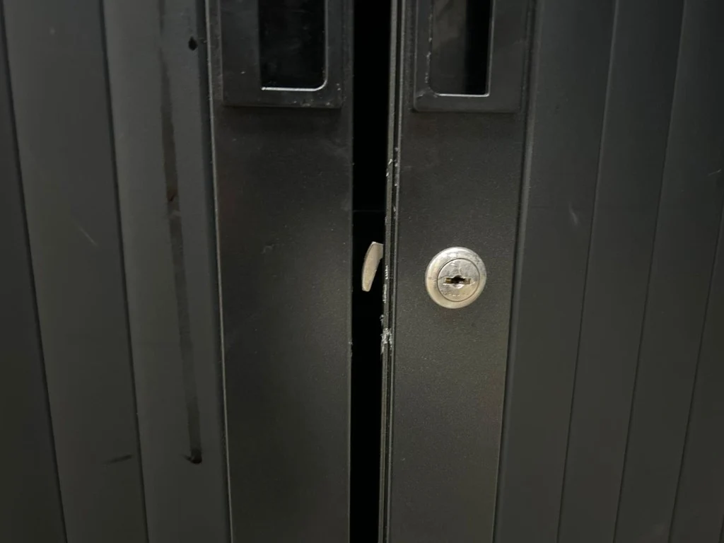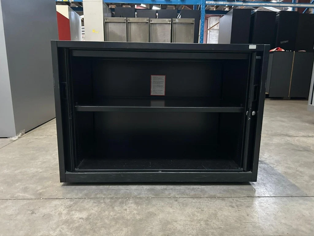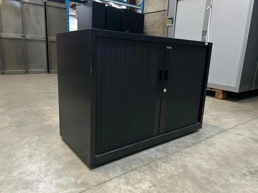 1 x GISPEN lage roldeurkast, afmetingen H70 X B100 X D47,kleur zwart, metaal ,1 legplank, slot is ingedraaid, geen sleutel aanwezig, met gebruiksporen (V0528)