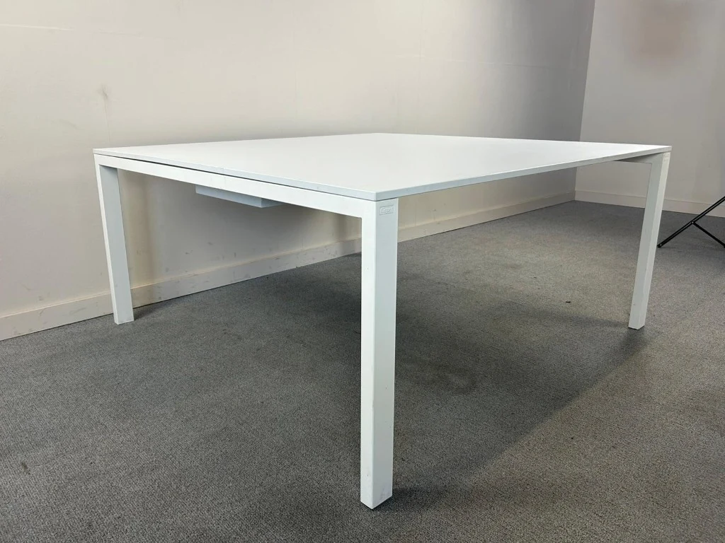 1x GISPEN vierkante bureautafel H76xB160xD160 - Wit/Melamine/Wit metaal, met gebruikssporen (V0460)