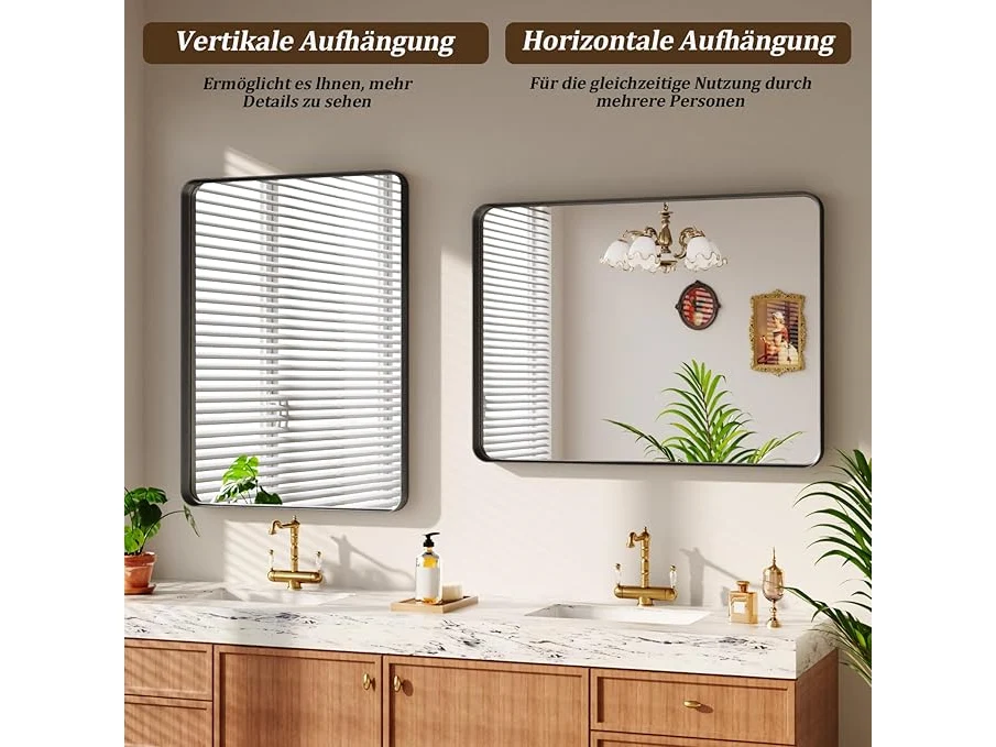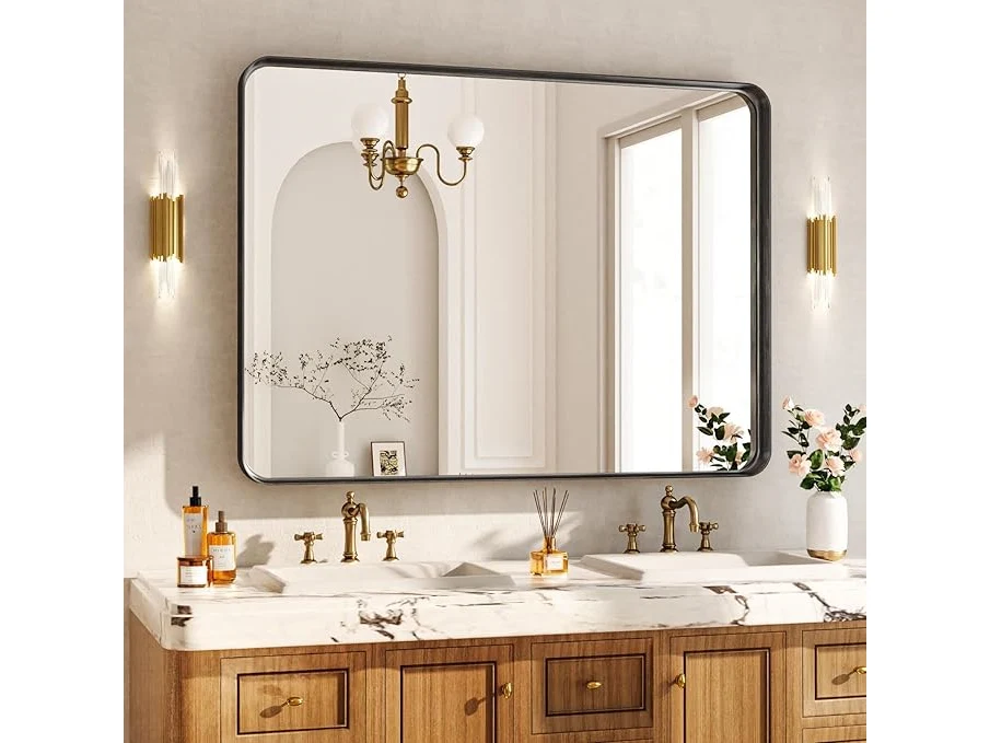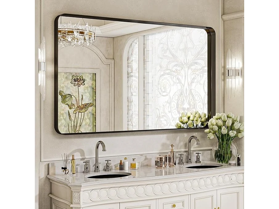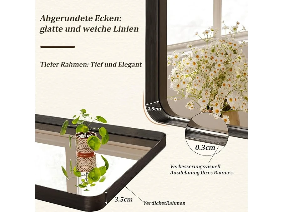Ongebruikt, volledig, ok, Koonmi Diepe lijst, wandspiegel, 120 x 90 cm, luxe high-end rechthoekige badkamerspiegel, gefileerde hoeklijst, spiegel, horizontaal of verticaal opgehangen, zwart, B0DLVWJ5YF