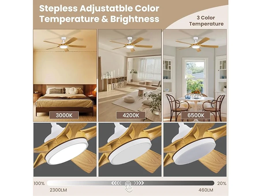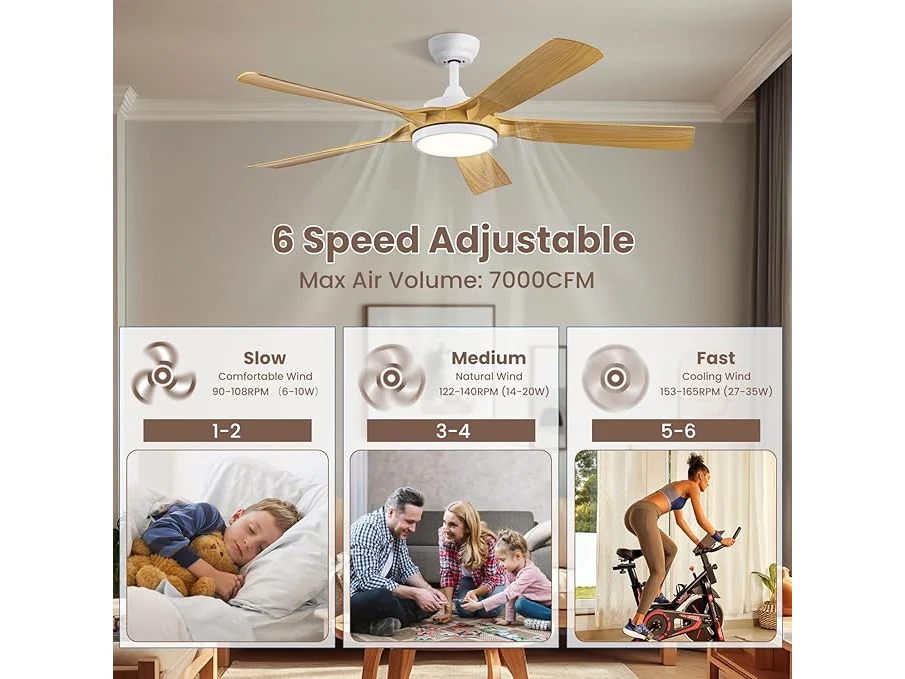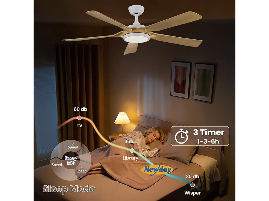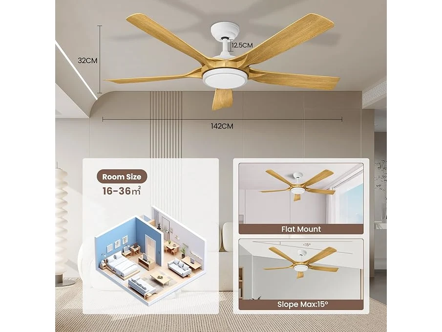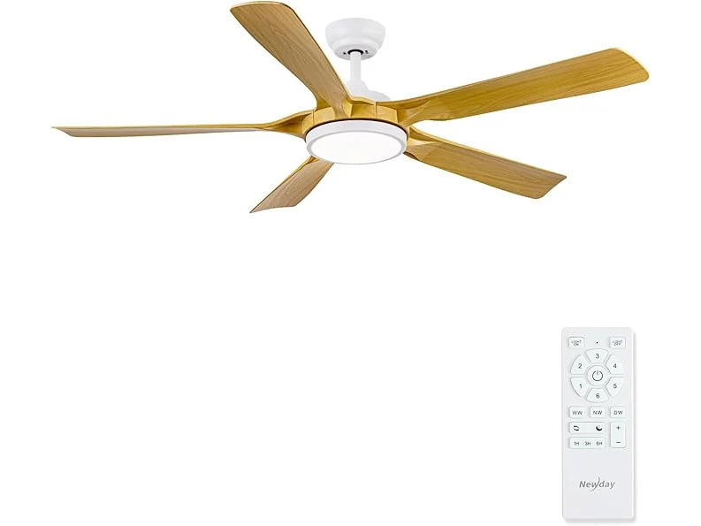 Ongebruikt, getest en werkend, volledig, ok, Newday Plafondventilator in houtkleur, 142 cm, plafondventilator met dimmer, grote plafondventilator met stille afstandsbediening, 5 vleugels, gelijkstroommotor, 6 snelheden voor woonkamer, B0CPLRVN86
