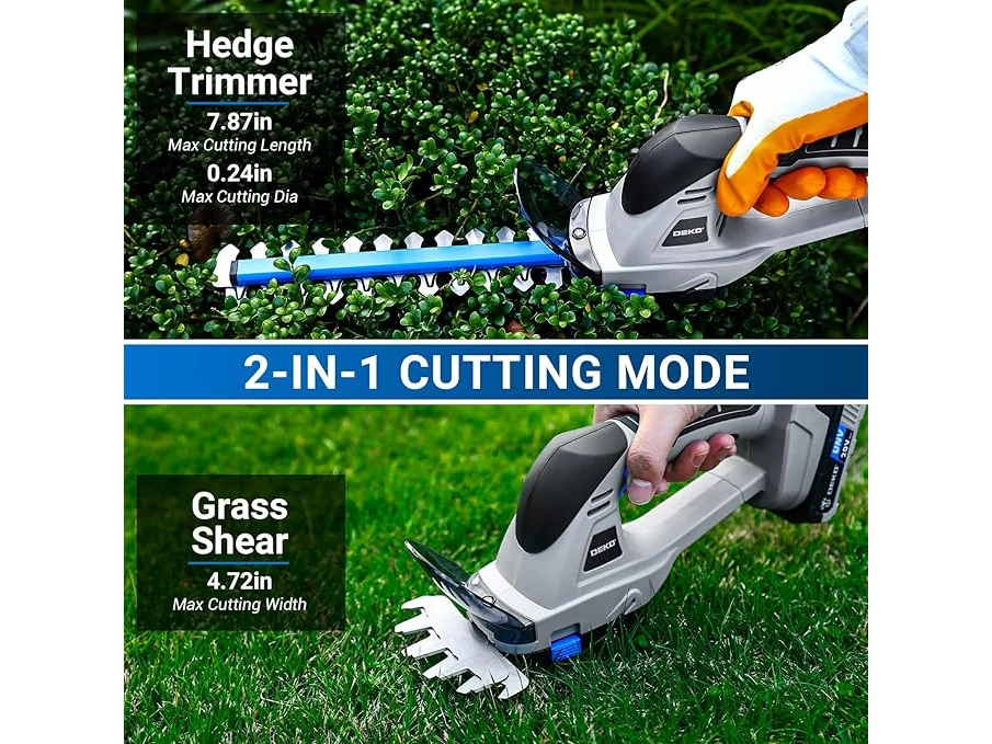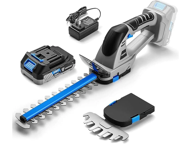 Ongebruikt, getest en werkend, volledig, ok, Snoerloze elektrische heggenschaar 20V snoerloze kettingzaag: DEKOPRO 2-in-1 elektrische tuinschaar met batterij en lader 2000mAh, tuingereedschap, snoeischaar grasschaar voor tuin gazon, blauw, B0DD7GDQ16