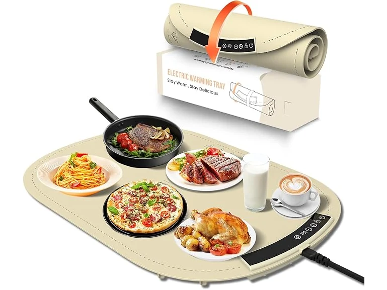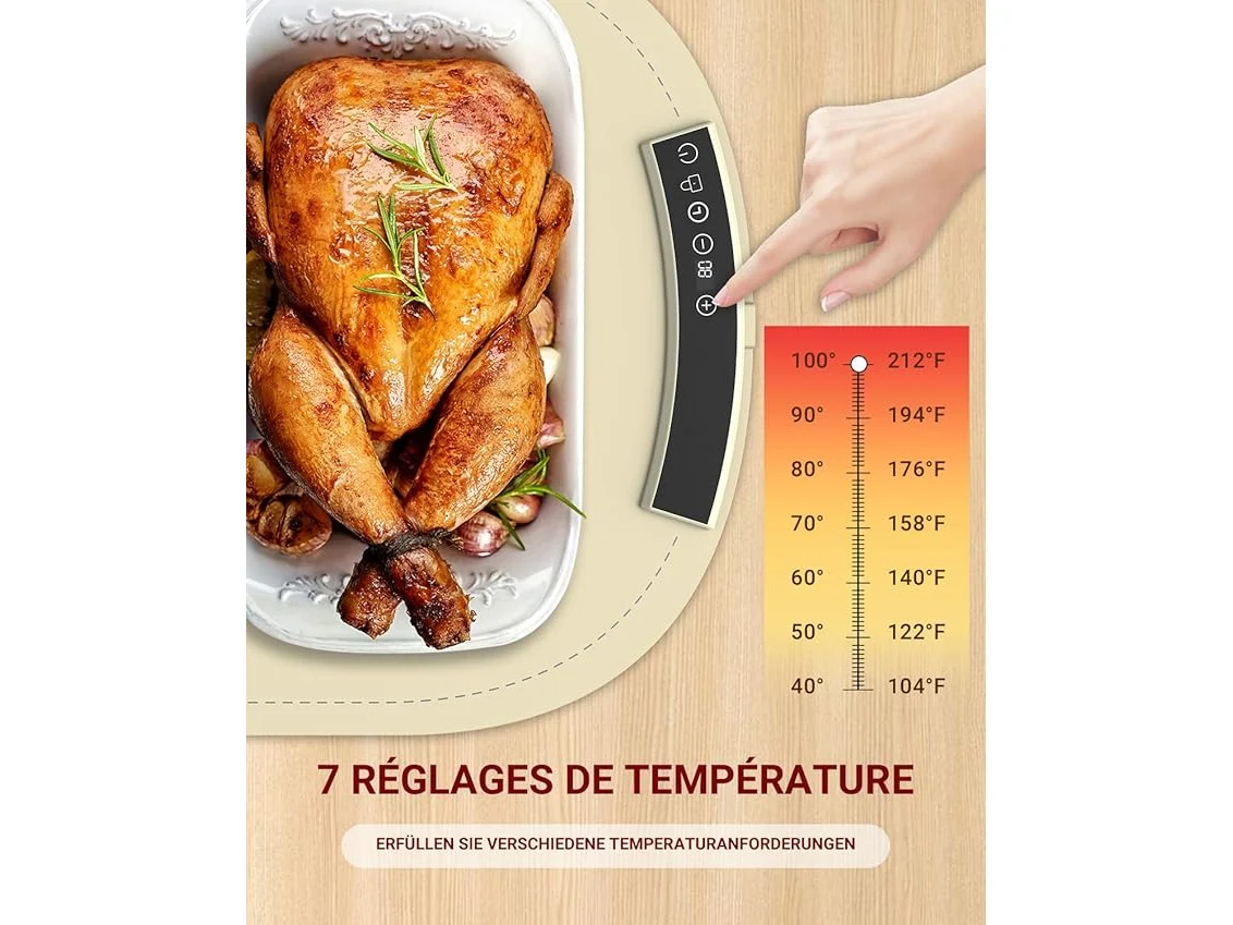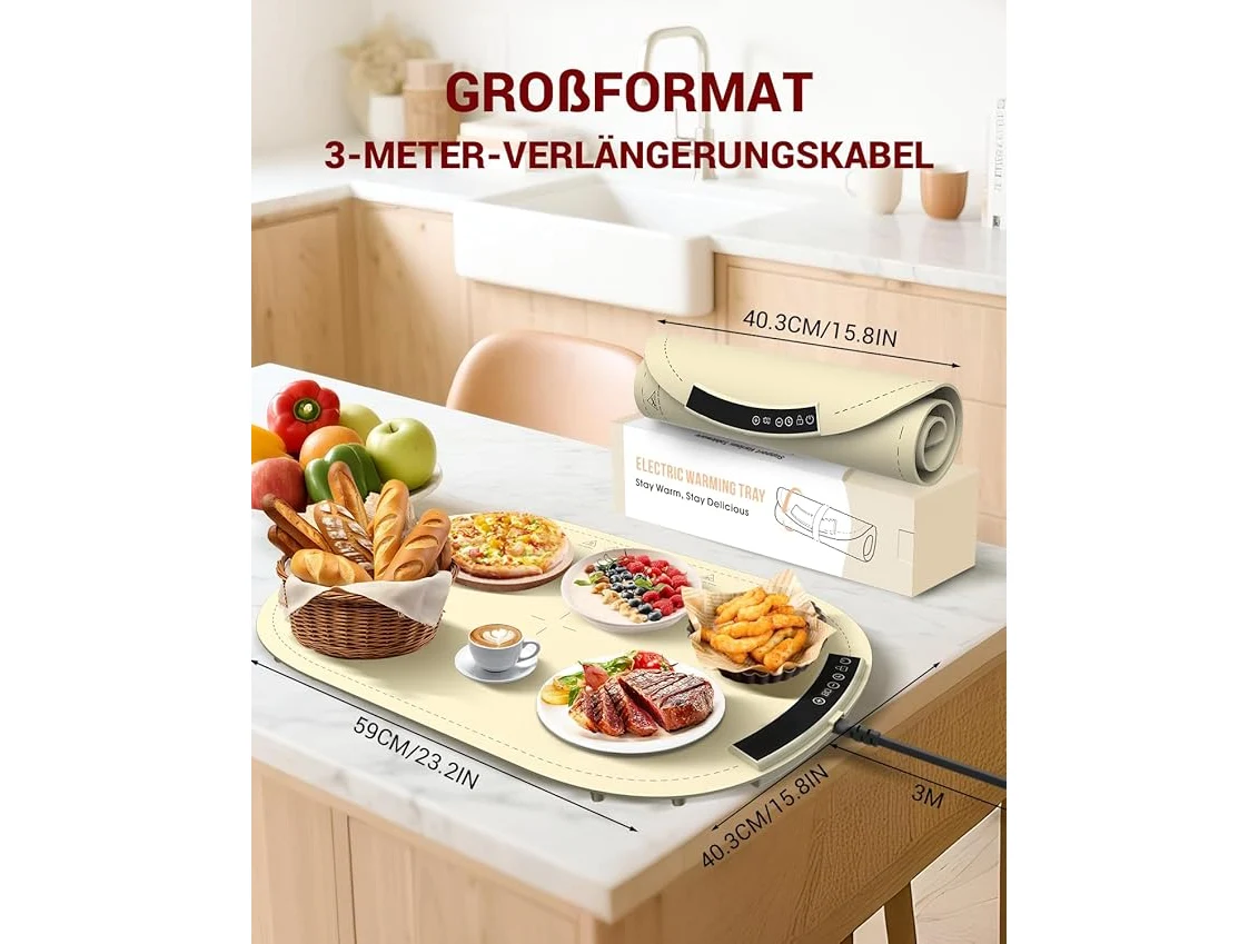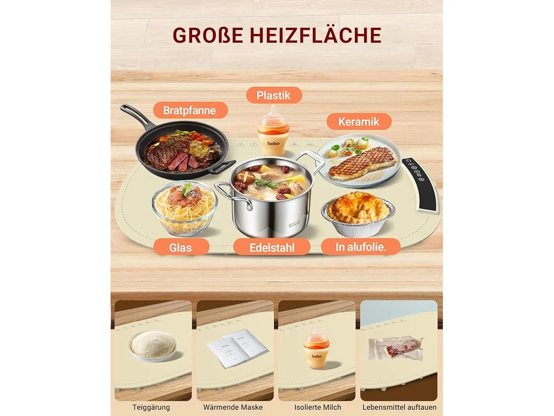 Ongebruikt, getest en werkend, volledig, ok, MYMULIKE Warmhoudplaat voor gerechten, 40-100 °C, elektrische voedselverwarmer, 4-uurs timer, draagbare siliconen warmteplaat, voor warm houden of ontdooien (crèmekleuren),B0DF1WVV3G