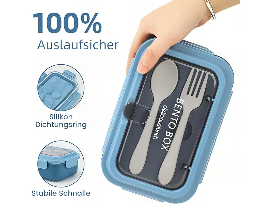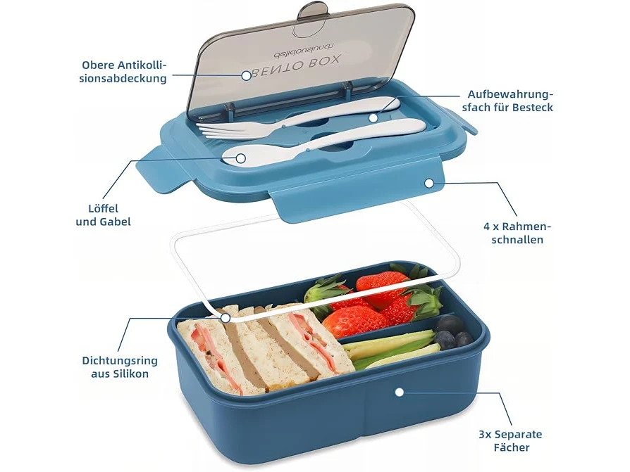 Ongebruikt, ok, Bugucat Lunchbox voor kinderen, 1200 ml, lekvrije broodtrommel met 3 vakken, bentobox voor kinderen, broodtrommel voor volwassenen met bestek, broodtrommel voor kinderdagverblijf en jongens, blauw, B0DKTBK49F