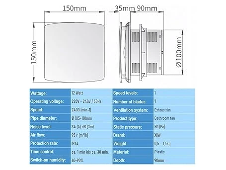 Ongebruikt, getest en werkend, ok, Badkamerventilator 100 mm met naloop, vochtsensor en terugslagklep, badkamerventilator, afvoerventilator, plafond- en wandmontage, voor keuken, loftramen en kelder, 95 m³/h, 12 watt, 34 dB,B0C7G3N6TM