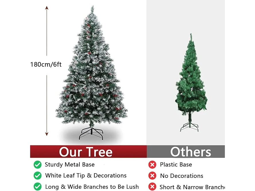Ongebruikt, volledig, ok, Kunstmatige Kerstboom, 6ft/180cm Sneeuwspray Kerstbomen met 1000 Sneeuwgeklooide Filialen, Dennenappels en Rode Bessen, Metalen Standaard, Xmax Boom voor Thuis, Kantoor, Feestdecoratie, B0B5V2STCS