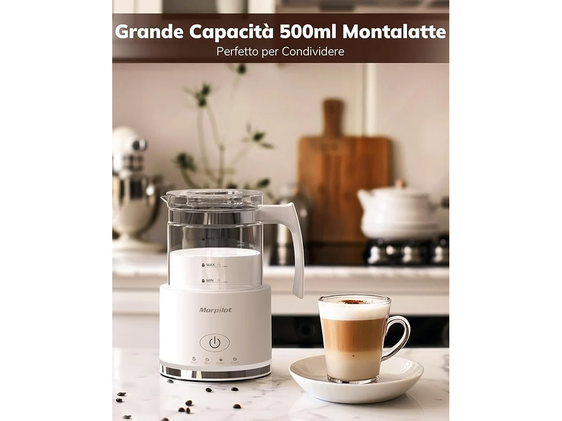Ongebruikt, getest en werkend, ok, Morpilot Elektrische melkopschuimer, melkopschuimer van glas, mooi te zien, 4-in-1 functie, inhoud 250 ml cappuccino of 500 ml warme melk, gedeeld design, wit, B0DB8GBBXH