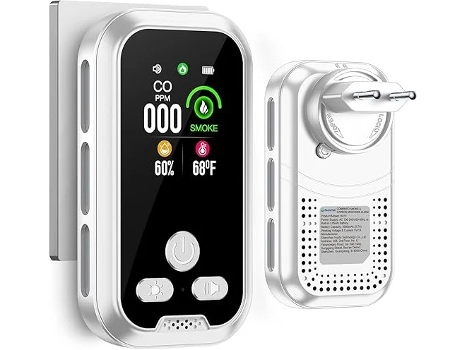 Ongeopend, Gedsffati Plug-in 4in1 Rookmelder koolmonoxide detector combinatie, met 2000mAh batterij en HD 2.1‘’ beeldscherm [CO rooktemperatuur vochtigheids monitor] plug and play, geschikt voor thuis, wit , B0DL3MKMBH