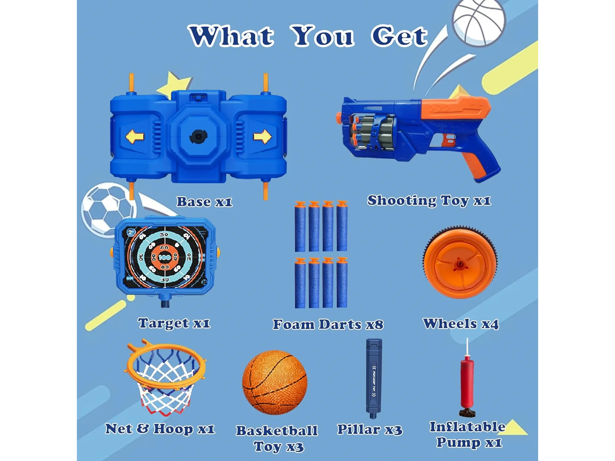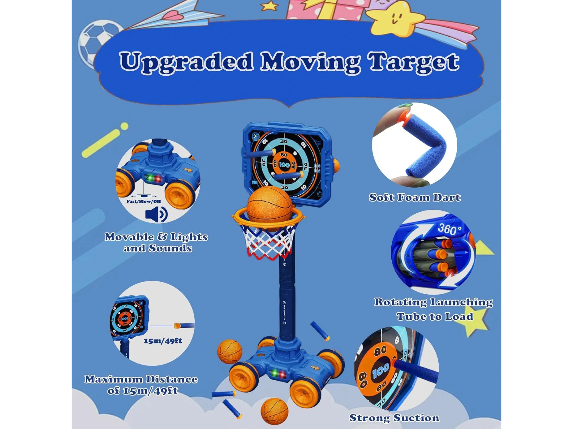 KalaDuck 2 In 1Basketbal en schietspel, bewegende basis, hoogteverstelbaar tot 98cm, incl basketballen en soft-pistool, B0D6FGMCN1