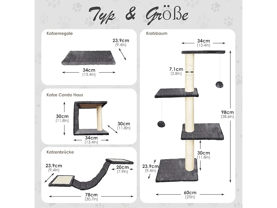 Ongeopend, HEVOL Krabpaal (98cm hoog) +Kattenklimwand, stabiel meubel met grote hangbrug, hangmat, krabzuilen en kattenhol,B0DHZHTXQC