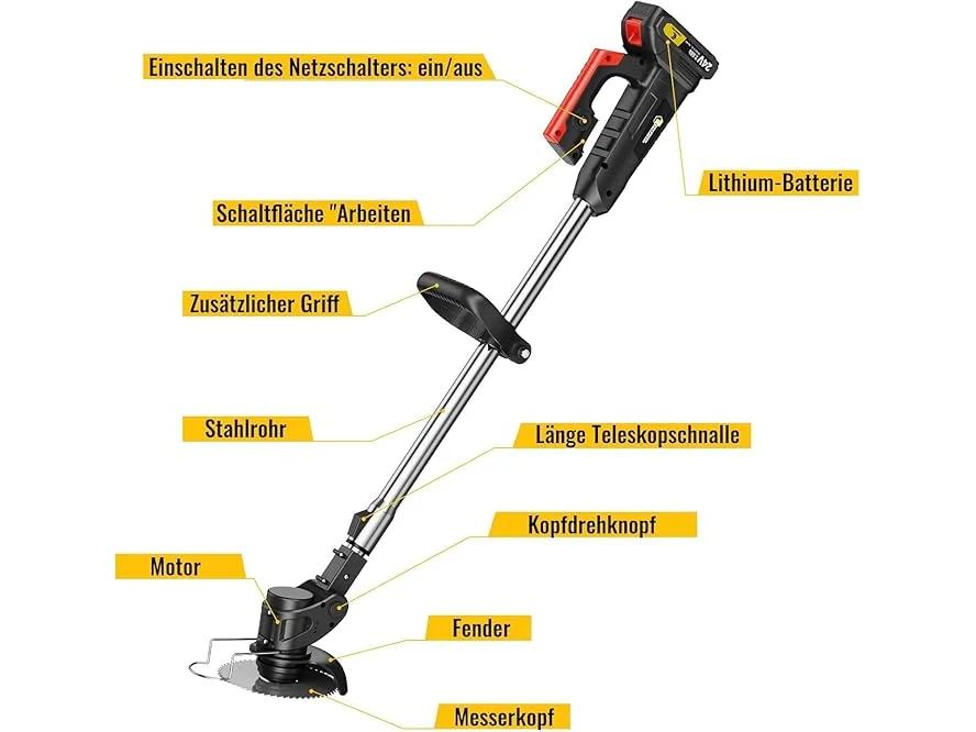 Gebruikssporen, getest en werkend,geen bril, enkele kuststofmessen ontbreken, ok, CONENTOOL Grastrimmer met accu, 600 W, met 2 x 2000 mAh accu, 24 V gazonkantensnijder met 4 soorten snijbladen, 8500 rpm/min bosmaaier, zwart (2025), B0FHPBPMQT