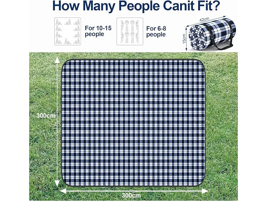 Minieme gebruikssporen, originele verpakking ontbreekt, ok, HUTHIM Picknickdeken, 300 x 300 cm, waterdicht, zandvrij, outdoor, wasbaar, XXL, picknickdeken, opvouwbare strandmat met schouderriem, ideaal voor strand, park, blauw-wit rooster,B0CPP5YQMJ