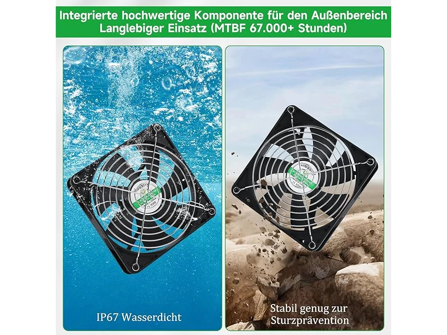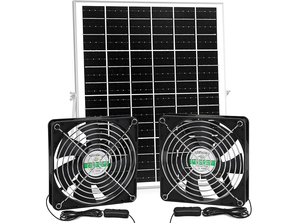 Minieme gebruikssporen, getest en werkend, ok, Blessny Ventilatorset op zonne-energie, 5,5 inch, 25 W zonnepaneel met 2 waterdichte ventilatoren voor kippenhokken buiten, broeikassen, schuren, toevoerlucht of afvoerlucht, met 4,5 m kabel, B0DSZY1KY7