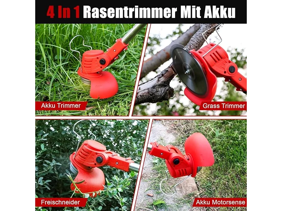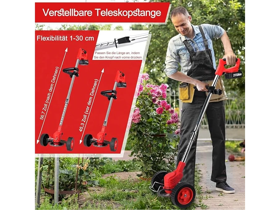 Ongebruikt, getest en werkend, ok, Xbzzgmg Accu-grastrimmer met accu, grastrimmer accu met 2 x 4,0 mAh, elektrische grastrimmer met 4 messen, accu grastrimmer met wielen, intrekbaar, trimmer tuin voor tuin, binnenplaats, trottoirs,B0F4JQDKK4