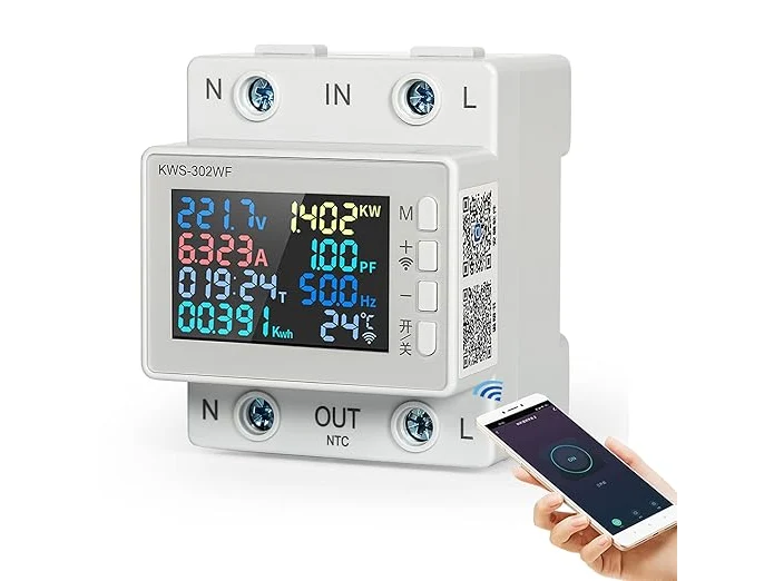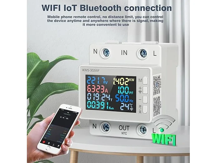 Ongebruikt, getest en werkend, volledig, ok, Stroommeter Wlan Tuya smart meter DIN-rail rail wisselstroommeter spanning/stroom/frequentie/vermogen/energie HD digitaal kleurendisplay AC170-300V/63A model KWS-302WF, B0CTCLSYCV
