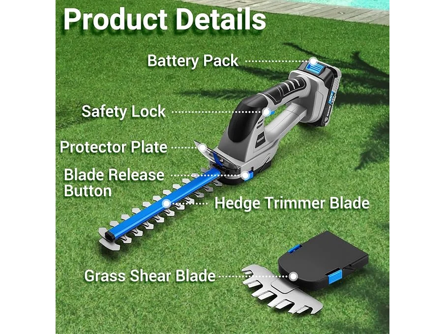 Gebruikssporen, getest en werkend, volledig, ok, Snoerloze elektrische heggenschaar 20V snoerloze kettingzaag: DEKOPRO 2-in-1 elektrische tuinschaar met batterij en lader 2000mAh, tuingereedschap, snoeischaar grasschaar voor tuin gazon, blauw, B0DD7GDQ16