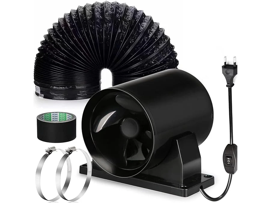 Ongeopend, Hose Vary Axiale luchtafzuiger, 100 mm, buisventilatorset (leidingsslang, klemmen), met 2 snelheden, knopschakelaar, B0BQDZCX8D