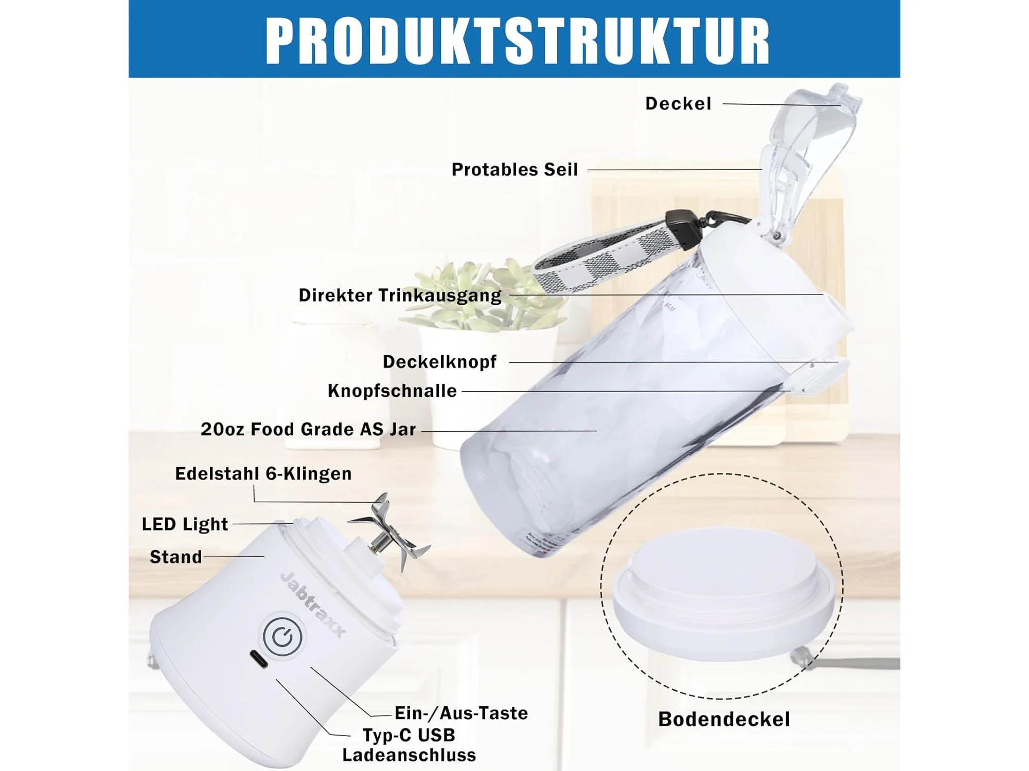 Ongeopend,Jabtraxx Draagbare 600 ml blender, mini-smoothiemixer, oplaadbaar, USB, sterke snijkracht met 6 ultrascherpe messen, wit, B0C4H8Y634