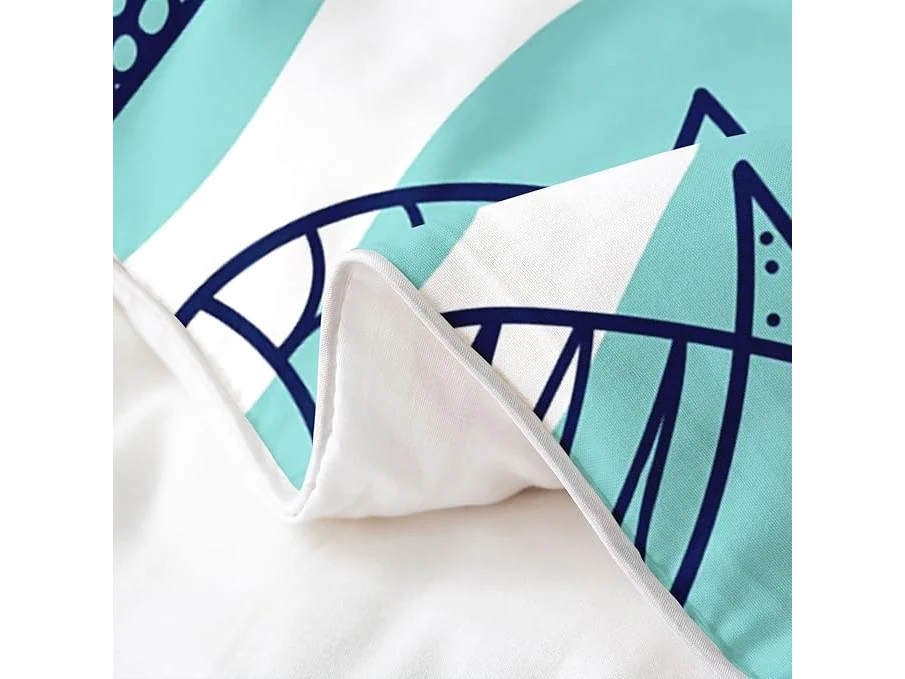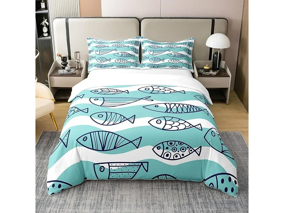 Ongeopend, in seal, Homewish Dekbedovertrek met cartoon vissen, 135 x 200 cm, geometrische vissen, 100% katoen, dekbedovertrek voor jongens, mintgroen en witte strepen, beddengoedset, B0CD7RL959